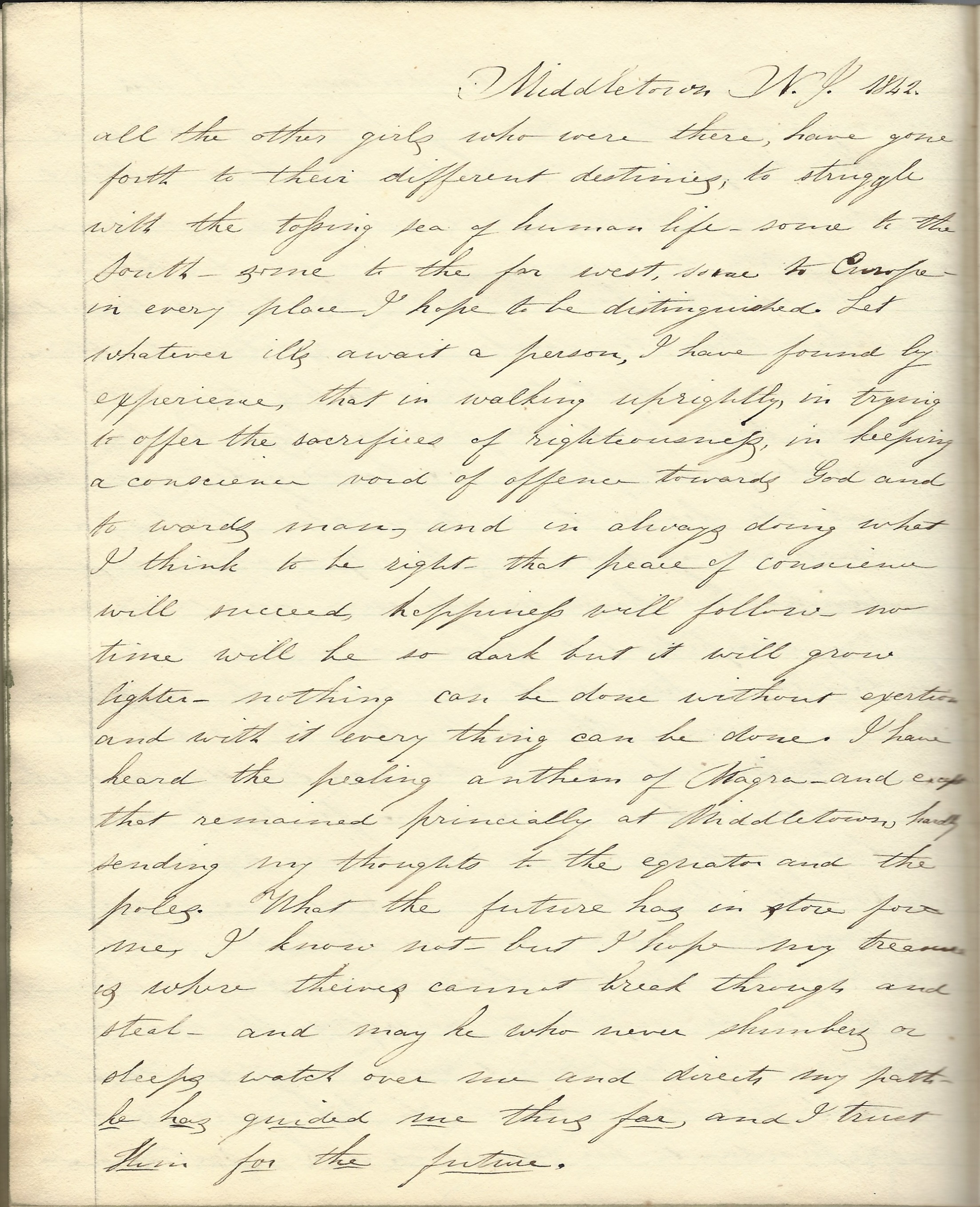 All the other girls who were there have gone forth to their different destinies, to struggle with the tossing sea of human life—some to the South, some to the far West, some to Europe—in every place I hope to be distinguished. Let whatever ills await a person, I have found by experience that in walking uprightly, in trying to offer the sacrifices of righteousness, in keeping a conscience void of offense towards God and towards man, and in always doing what I think to be right, that peace of conscience will succeed, happiness will follow—no time will be so dark but it will grow lighter. Nothing can be done without exertion and with it everything can be done. I have heard the pealing anthem of Niagara and except that I remained principally at Middletown, hardly sending my thoughts to the equator and poles, what the future has in store for me, I know not. But I hope my treasure is where thieves cannot break through and steal. And may He who never slumbers or sleeps, watch over me and direct my path. He has guided me thus far and I trust Him for the future.