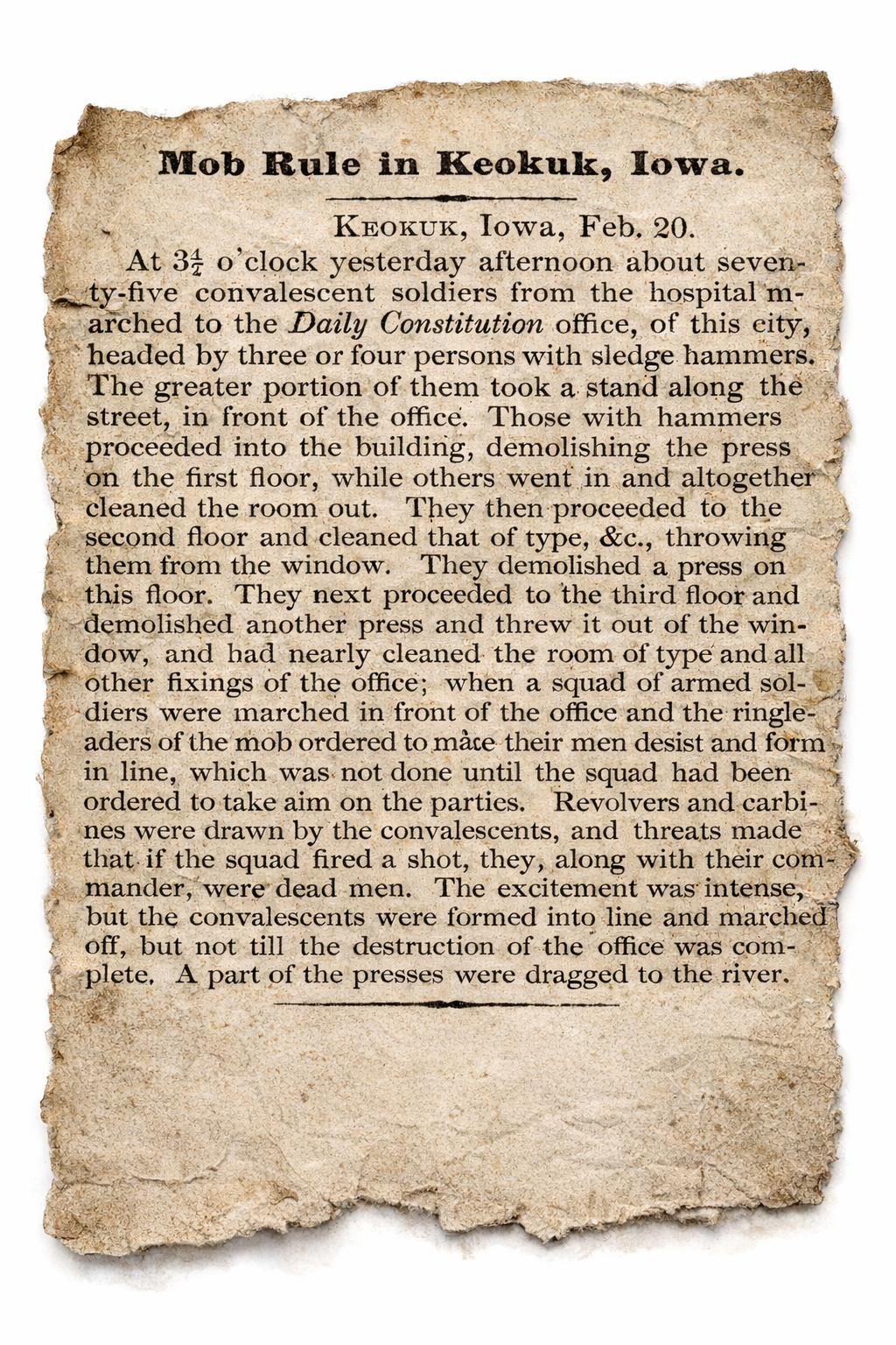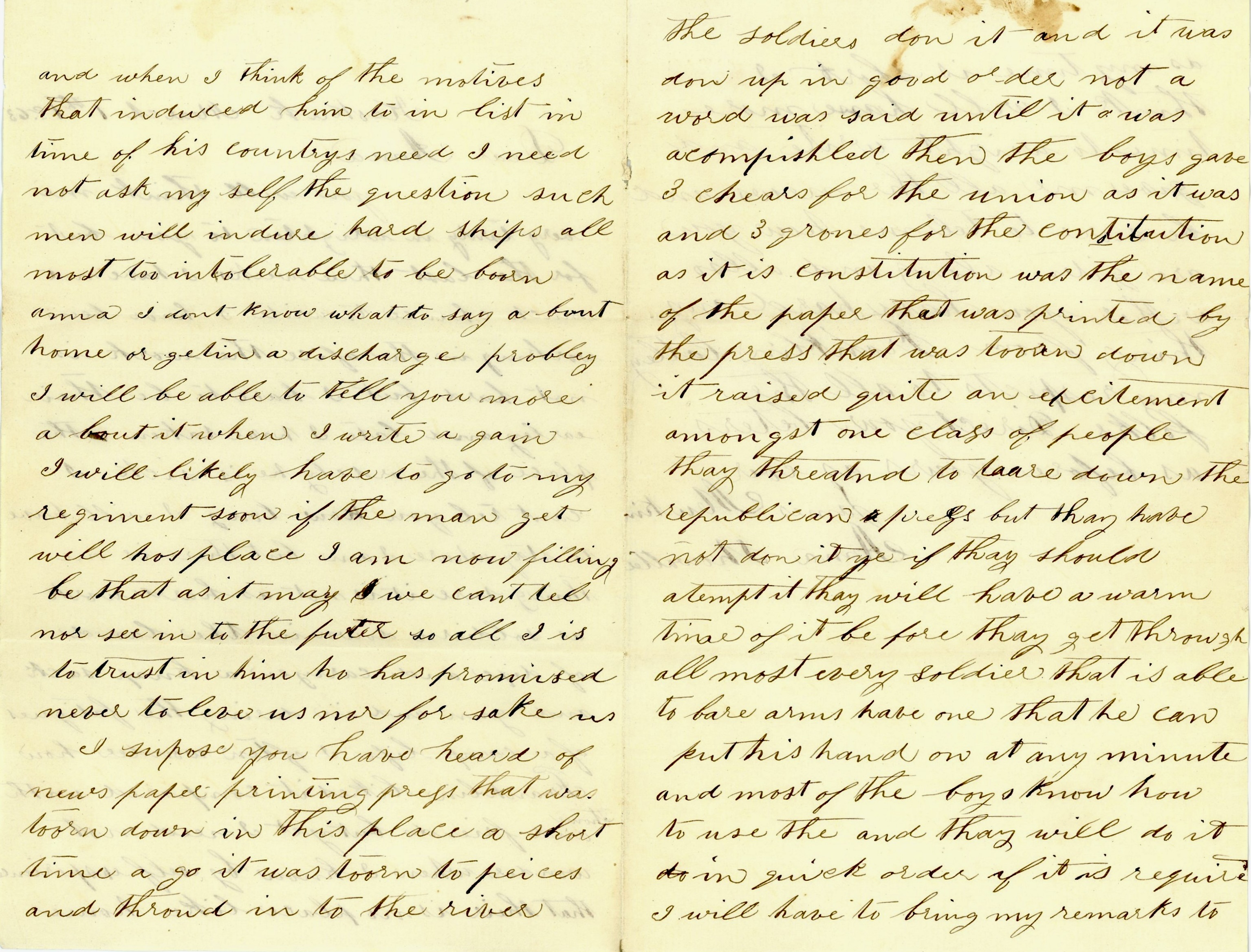 I suppose you have heard of the newspaper printing press that was torn down in this place a short time ago. It was torn to pieces and throwed in the river. The soldiers done it and it was done up in good order. Not a word was said until it was accomplished. Then the boys gave three cheers for the Union as it was and three groans for the Constitution as it is. The [Daily] Constitution was the name of the paper that was printed by the press that was torn down. It raised quite an excitement amongst one class of people. They threatened to tear down the Republican Press but they have not done it yet. If they should attept it, they will have a warm time of it before they get through. Almost every soldier that is able to bear arms have one that he can put his hand on at any minute and most of the boys know how to use them and they will do it in quick order if it is required.