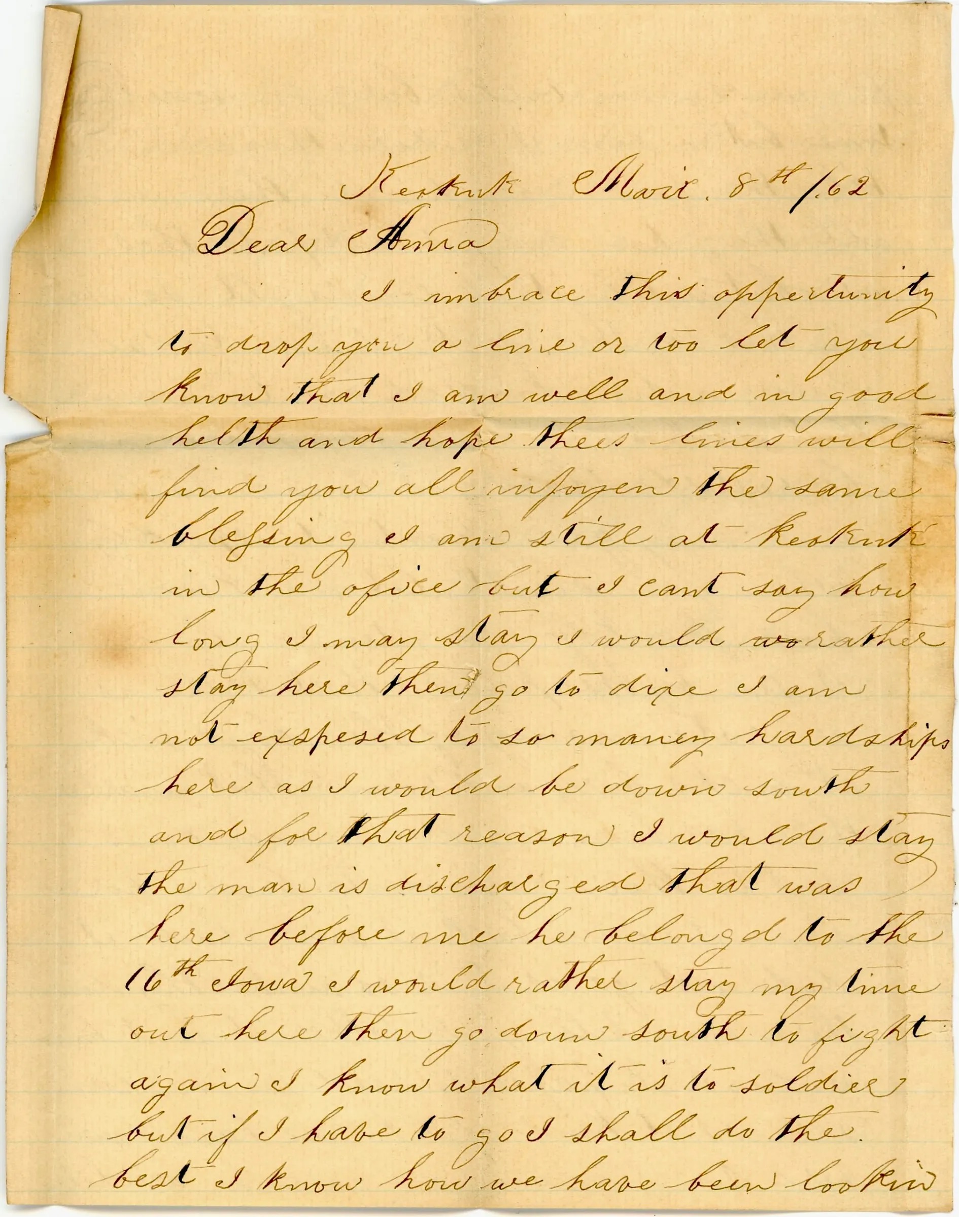 I embrace this opportunity to drop you a line or two to let you know that I am well and in good health and hope these lines will find you all enjoying the same blessing. I am still at Keokuk in the office but I can’t say how long I may stay. I would rather stay here than go to Dixie. I am not exposed to so many hardships here as I would be down south, and for that reason I would stay. The man is discharged that was here before me. He belonged to the 16th Iowa. I would rather stay my time out here than go down south to fight again. I know what it is to soldier. But if I have to go, I shall do the best I know how.