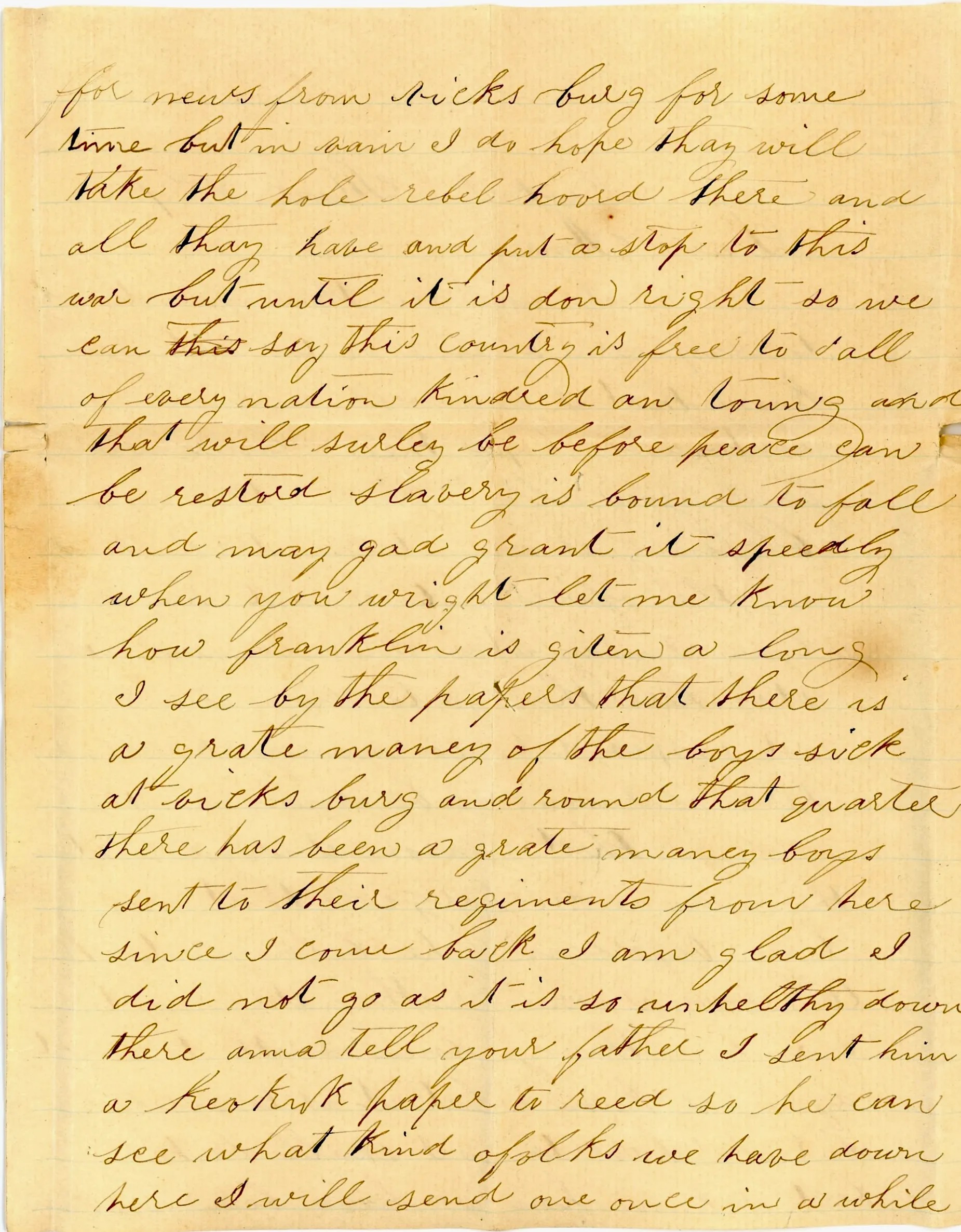 We have been looking for news from Vicksburg for some time but in vain. I do hope they will take the whole rebel horde there and all they have and put a stop to this war. But until it is done right so we can say this country is free to all of every nation, kindred and town, and that will surely be before peace can be restored. Slavery is bound to fall and may God grant it speedily. When you write, let me know how Franklin is getting along.