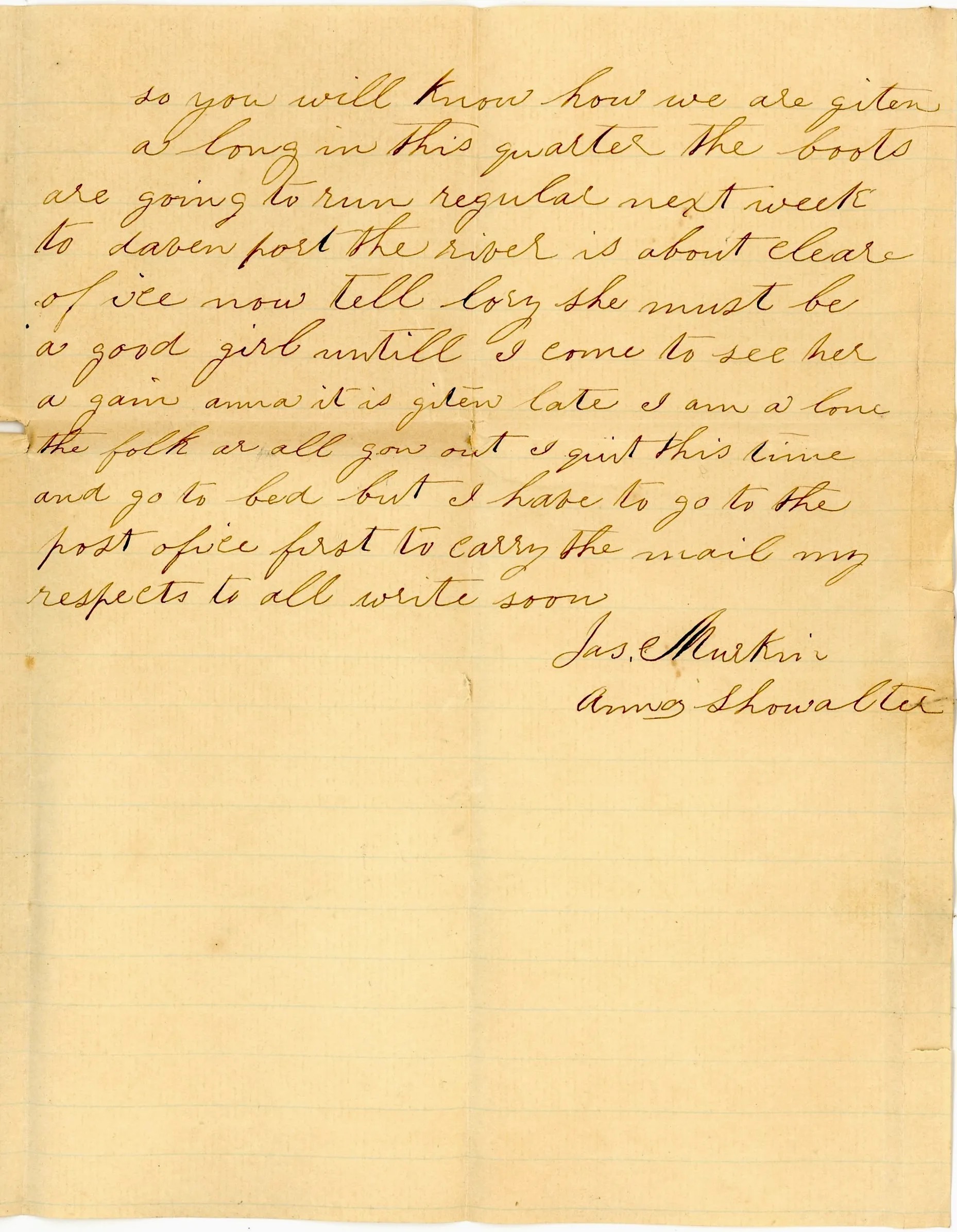Tell Cory she must be a good girl until I come to see her again. Anna, it is getting late. I am alone. The folks are all gone out and I [must] quit this time and go to bed. But I have to go to the post office first to carry the mail. My respects to all. Write soon. — Jas. Murkin