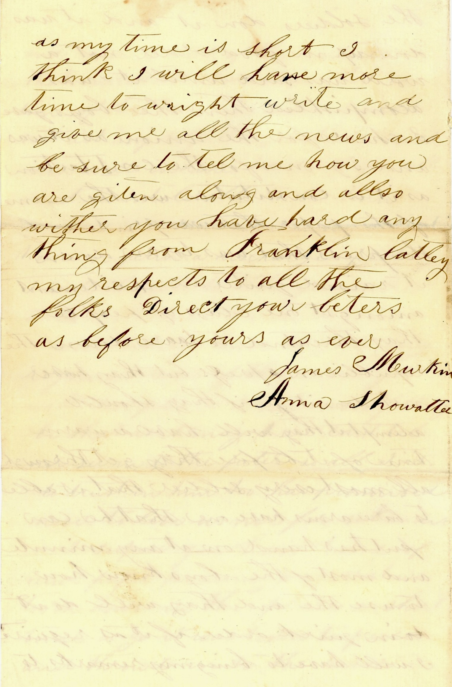 I will have to bring my remarks to a close as my time is short. I think I will have more time to write [later]. Give me all the news and be sure to tell me how you are getting along and also whether you have heard anything from Franklin lately. My respects to all the folks. Direct your letters as before as ever, — James Murkin