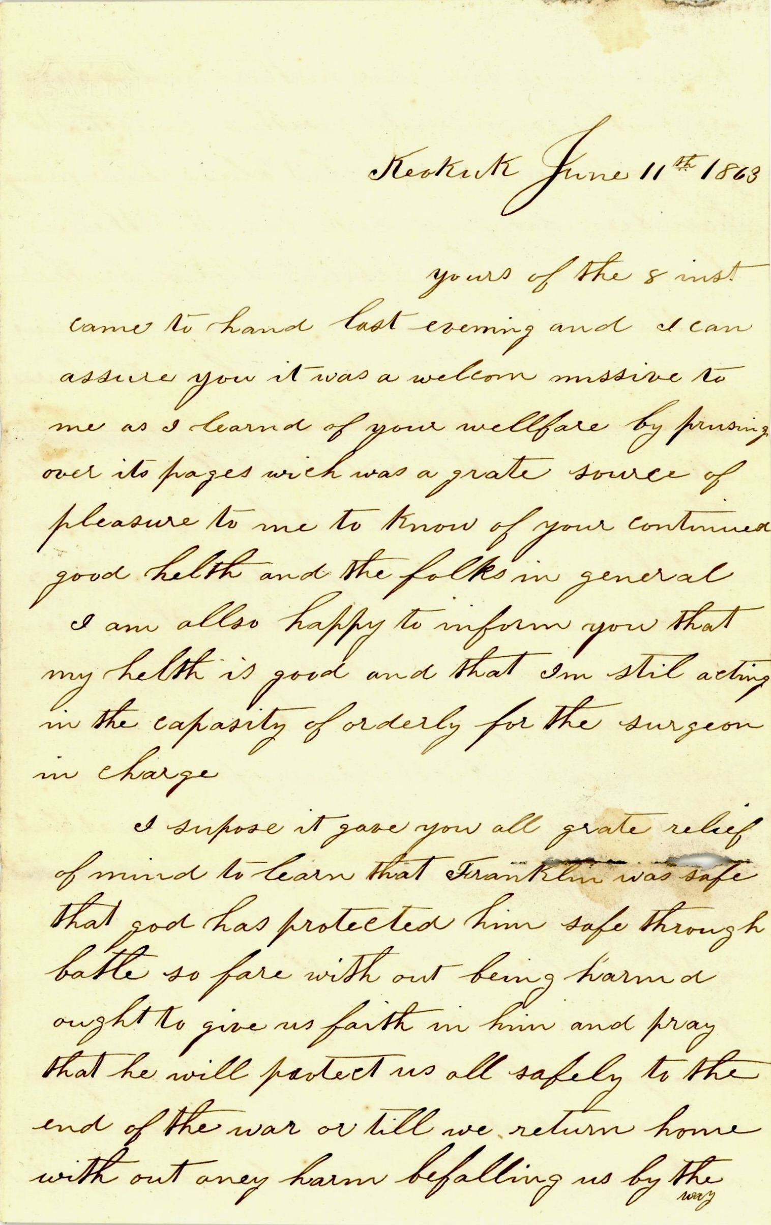 Yours of the 8th inst. came to hand last evening and I can assure you it was a welcome missive to me as I learned of your welfare by perusing over its pages which was a great source of pleasure to me to know of your continued good health and the folks in general. I am also happy to inform you that my health is good and that I’m still acting in the capacity of orderly for the surgeon in charge.