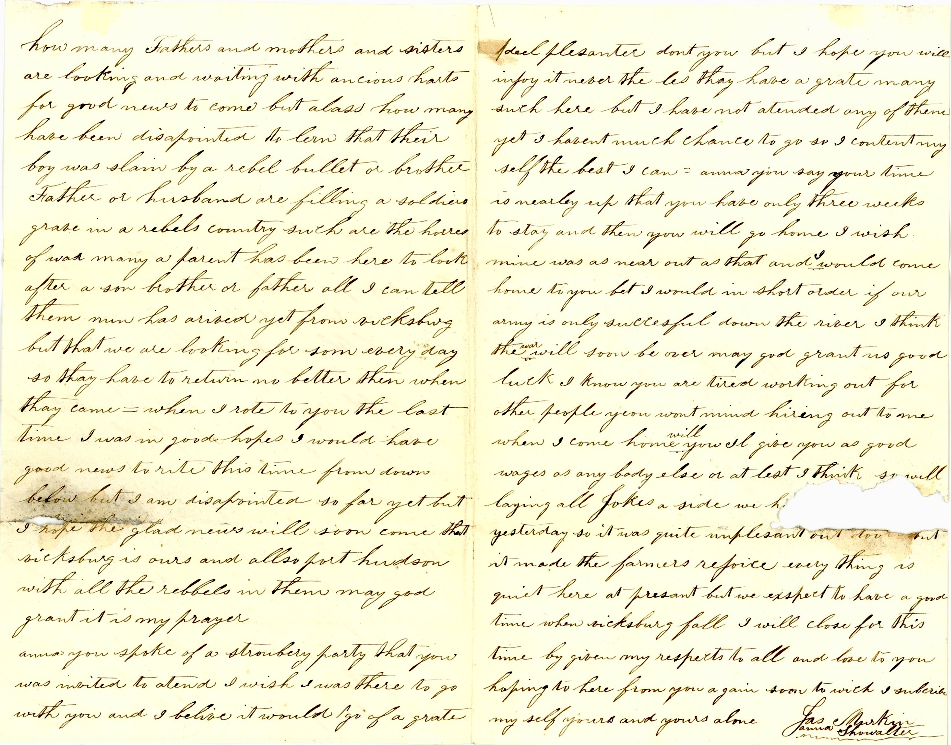 I know you are tired working out for other people. You won’t hiring out to me when I come home, will you? I’ll give you as good wages as anybody else, or at least I think so. Well, laying all jokes aside, we had [paper torn] yesterday so it was quite unpleasant out. But it made the farmers rejoice. Everything is quiet here at present but we expect to have a good time when Vicksburg falls.