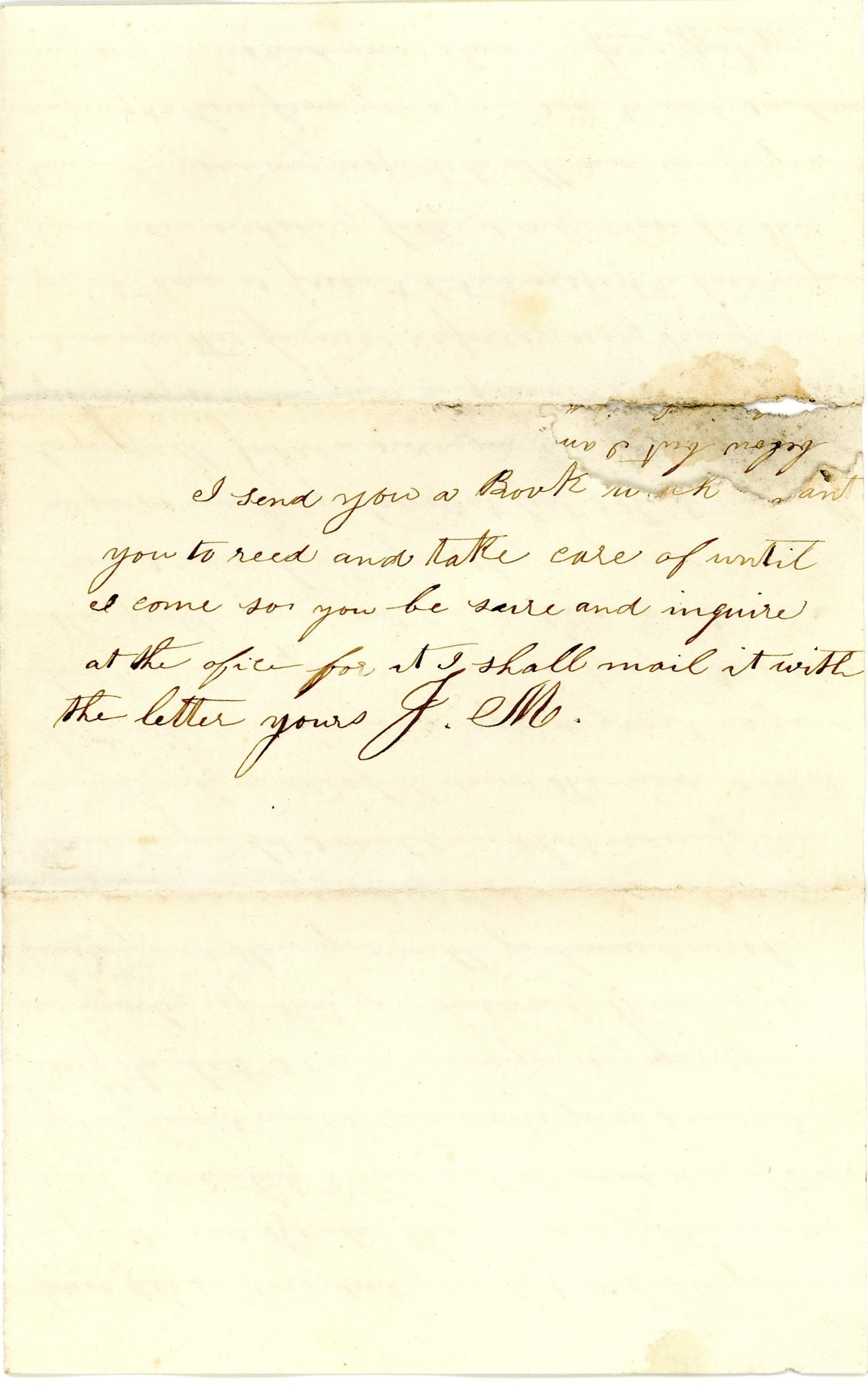 I send you a book which I want you to read and take care of until I come so you be sure and enquirer at the office for it. I shall mail it with the letter. Yours, — J. M.