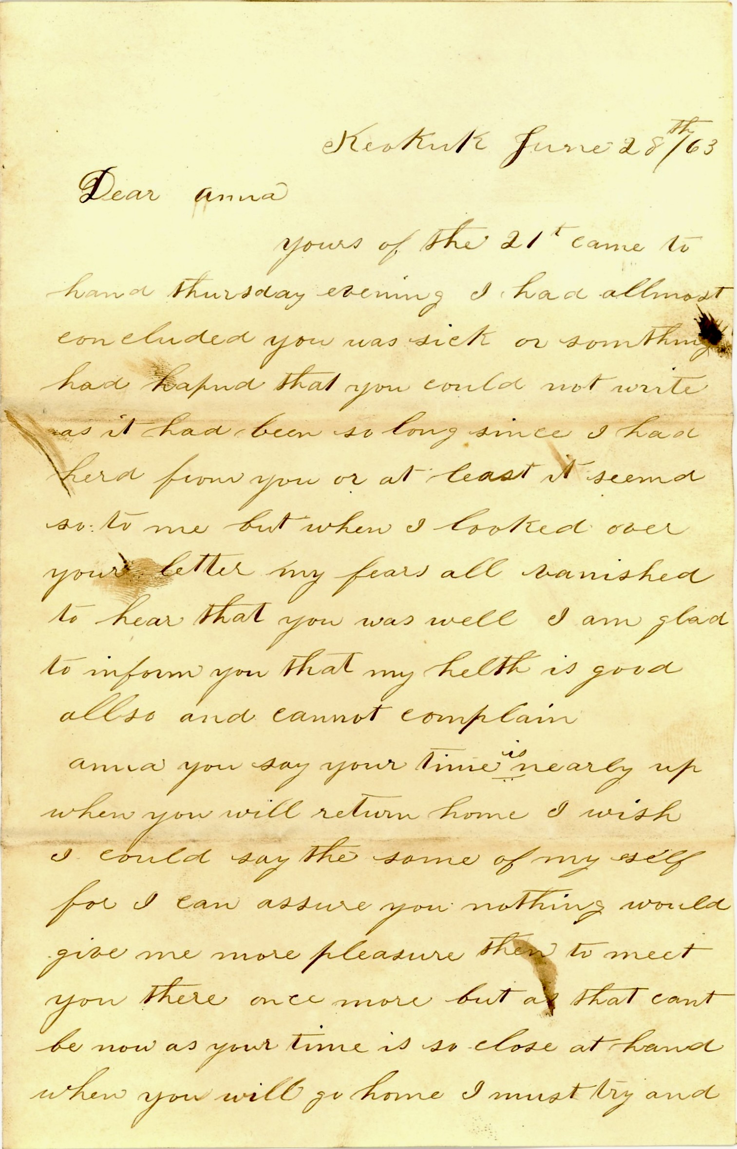 Anna, you say your time is nearly up—that you have only three weeks to stay and then you will go home. I wish mine was as near out as that and I would come home to you, bet I would, in short order, If our army is only successful down the river, I think the war will soon be over. May God grant us good luck.
