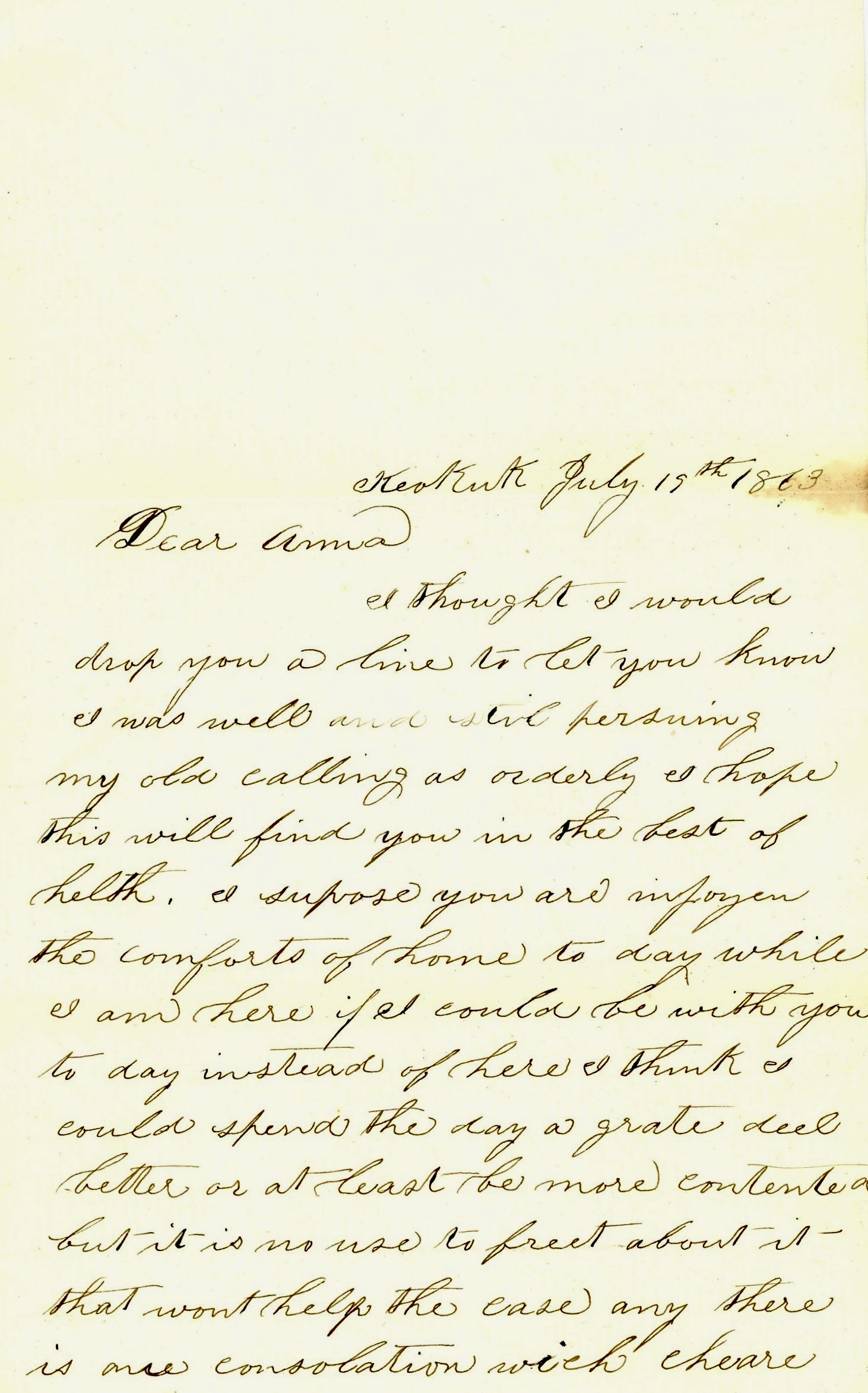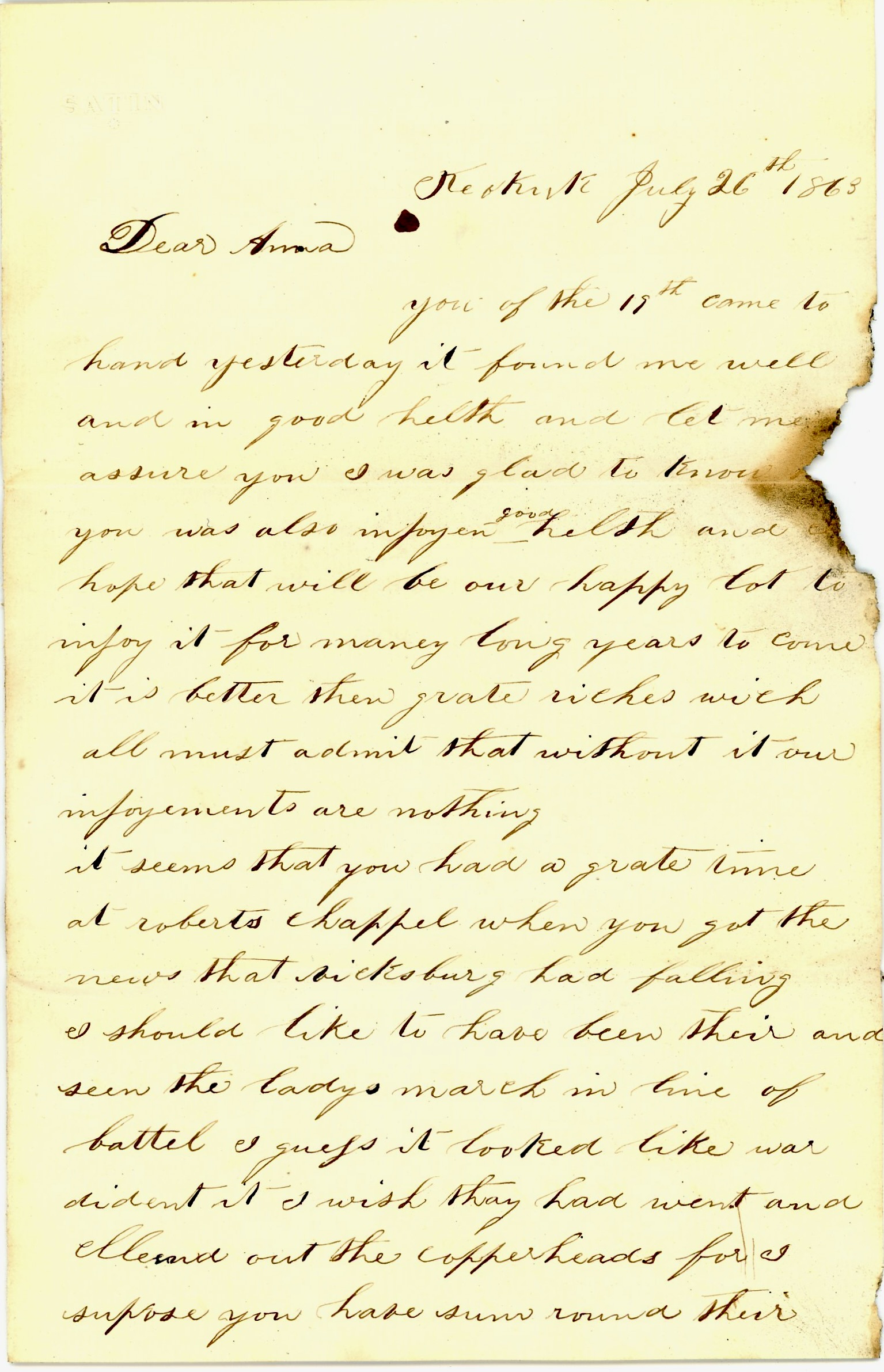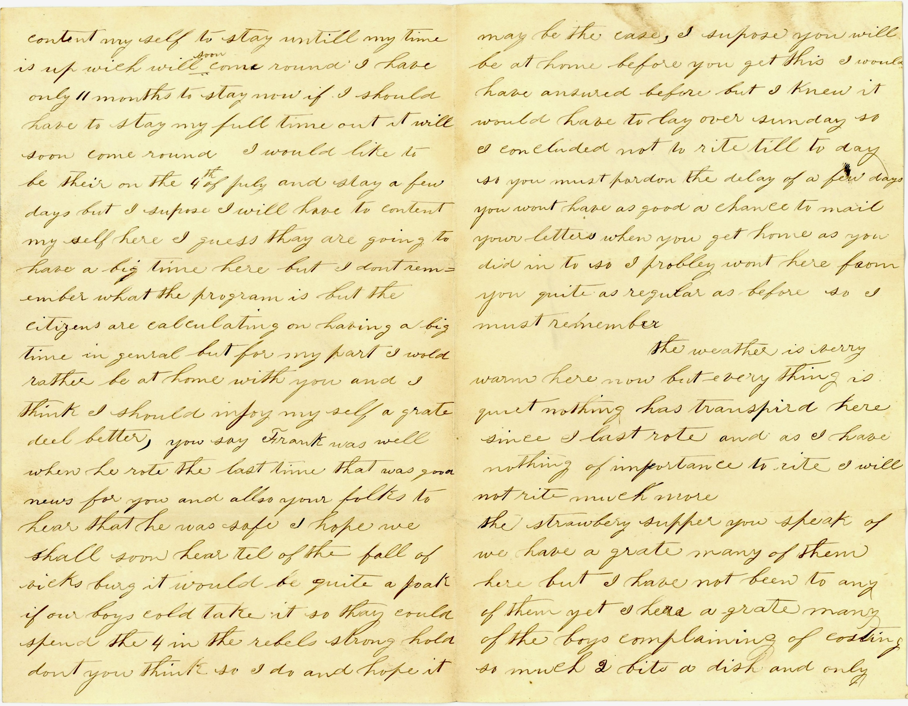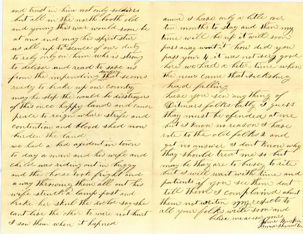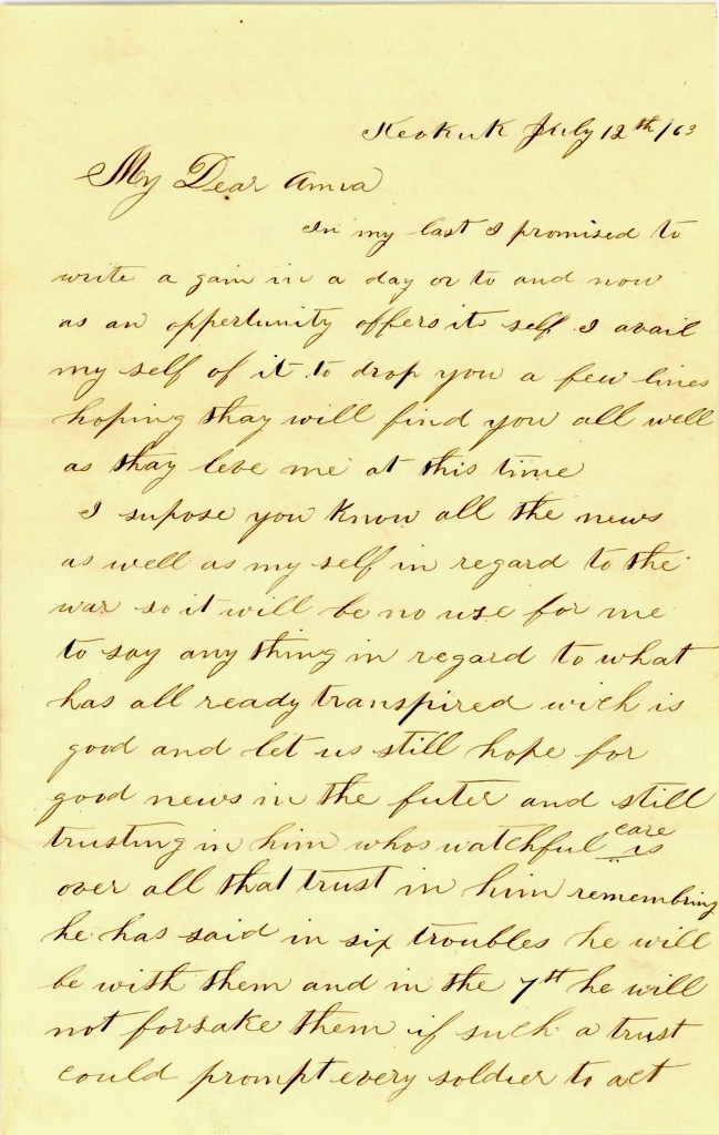 Anna, I have only a little over ten months to stay and then my time will be up. It will soon pass away, won’t it? How did you pass your 4th [of July]? It was not very good here. We had a better time when the news came that Vicksburg had fallen.