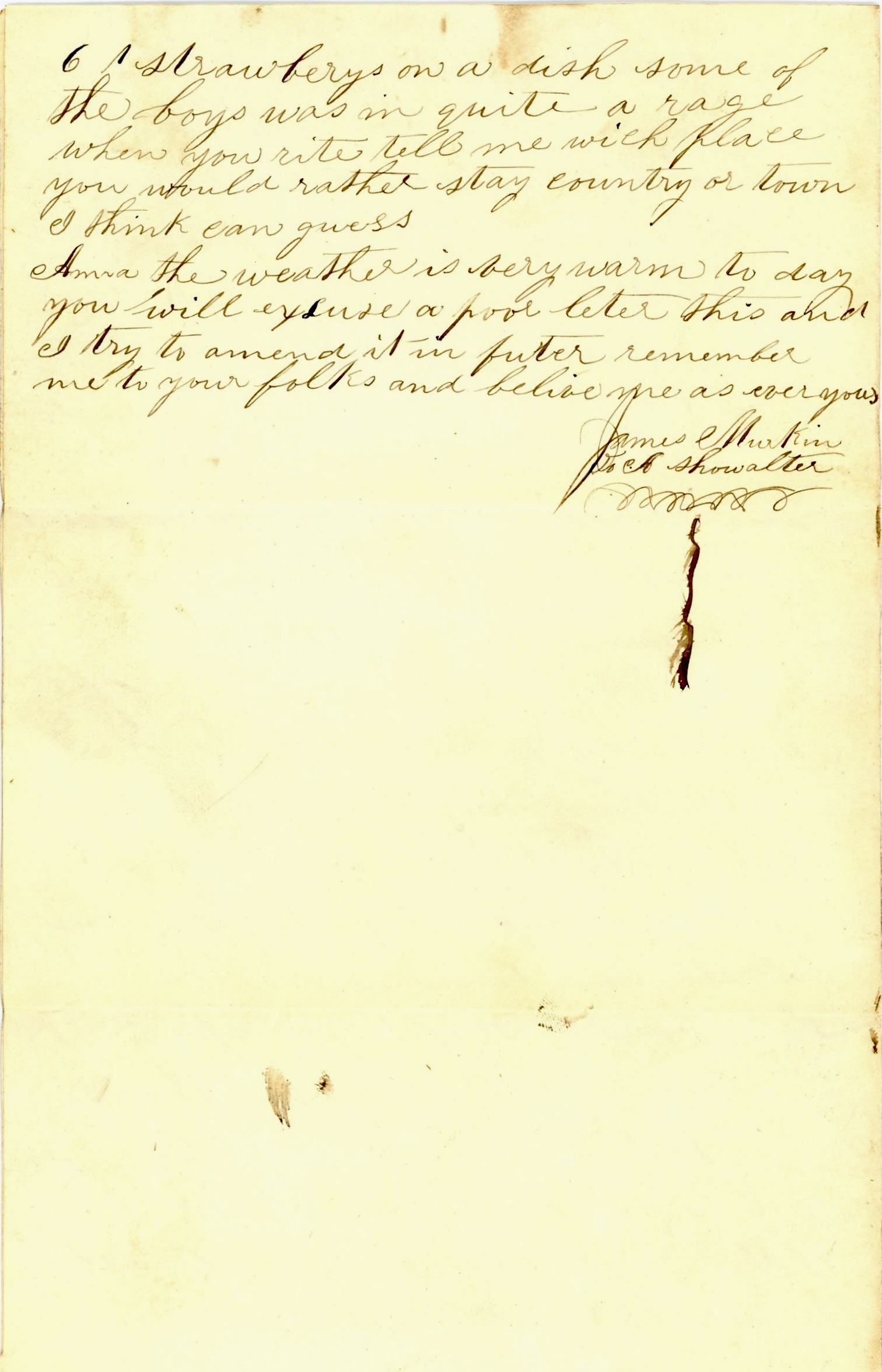 Anna, the weather is very warm today. You will excuse a poor letter this [time] and I will try to amend it in future. Remember me to your folks and believe me as ever yours, — James Murkin