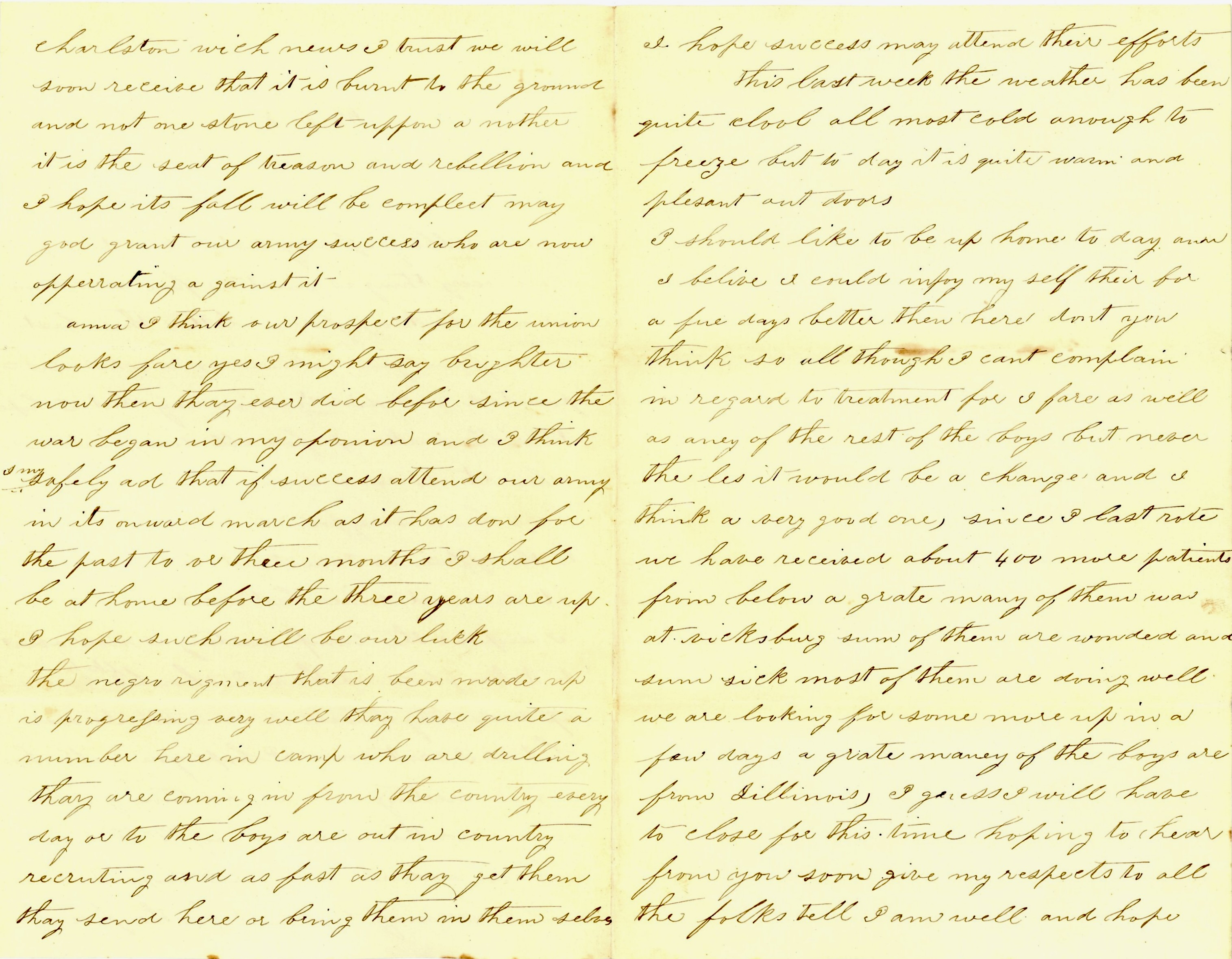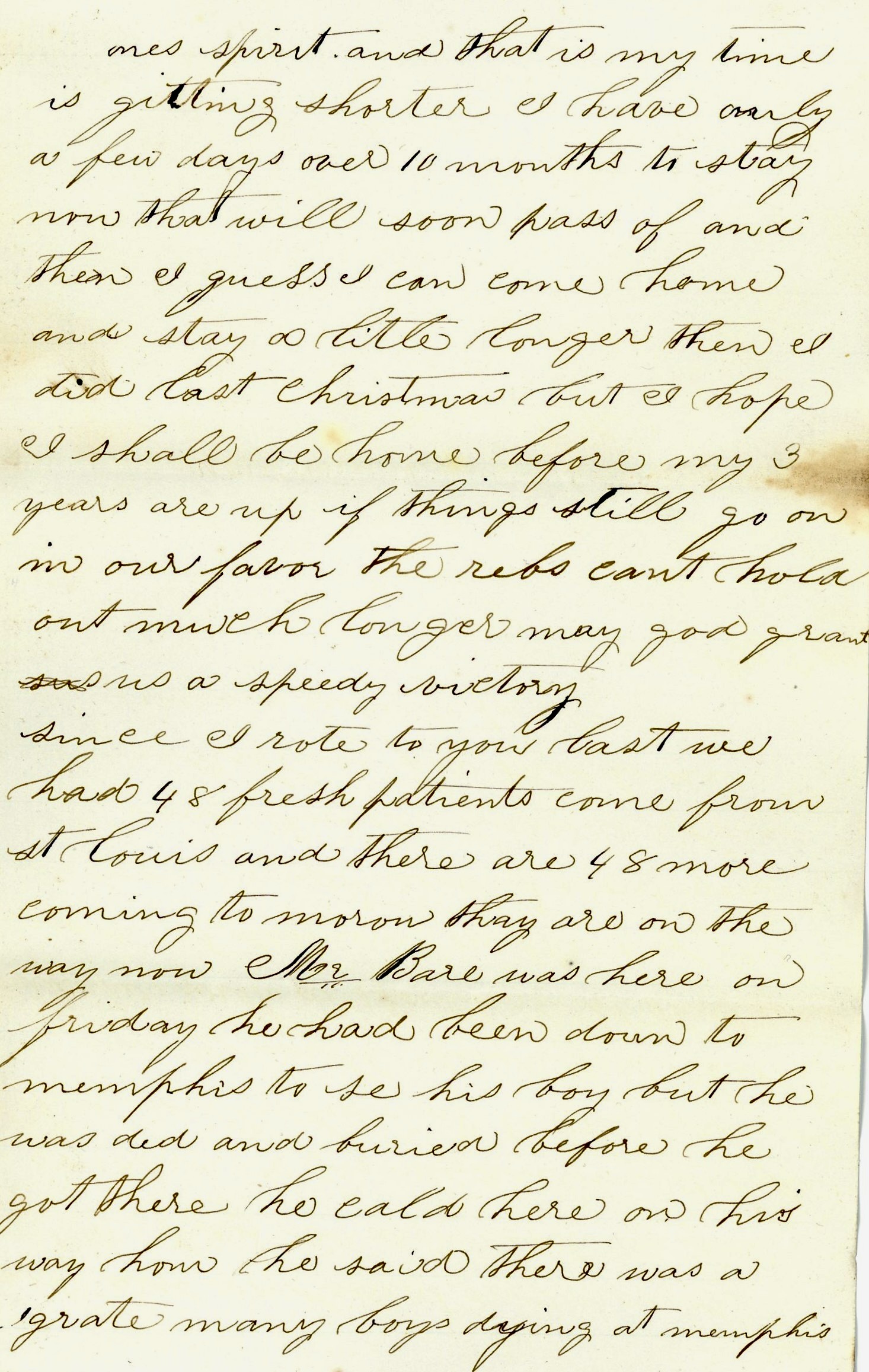 Since I wrote to you last, we had 48 fresh patients come from St. Louis and there are 48 more coming tomorrow. They are on the way now. Mr. [Gideon] Bear was here on Friday. He had been down to Memphis to see his boy [William] 1 but he was dead and buried before he got there. He called here on his way home. He said there was a great many boys dying at Memphis who was wounded at and around Vicksburg. We are looking for good news from Charleston. I hope they will burn it to the ground.