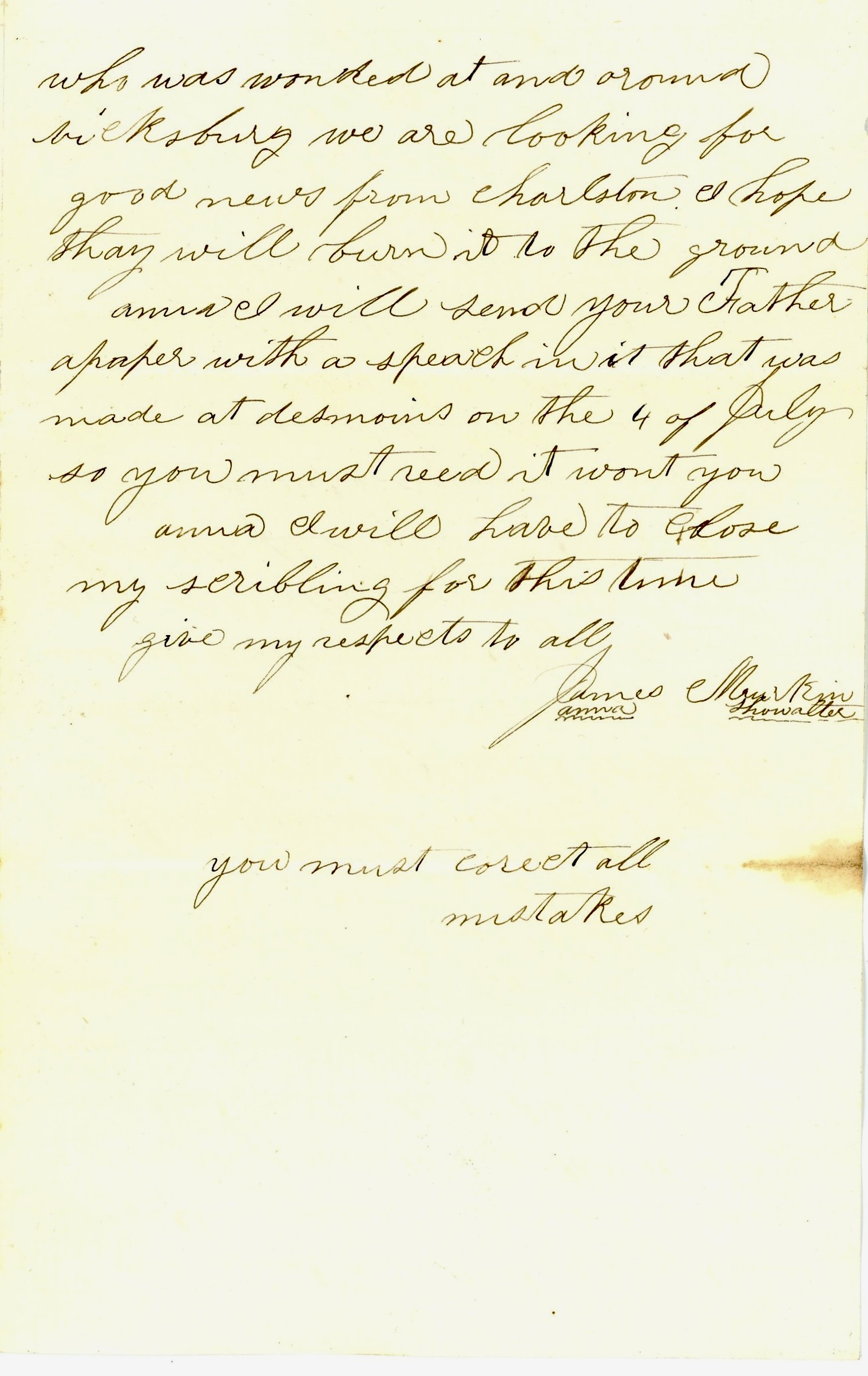Anna, I will send your Father a paper with a speech in it that was made at Des Moines on the 4th of July so you must read it, won’t you?