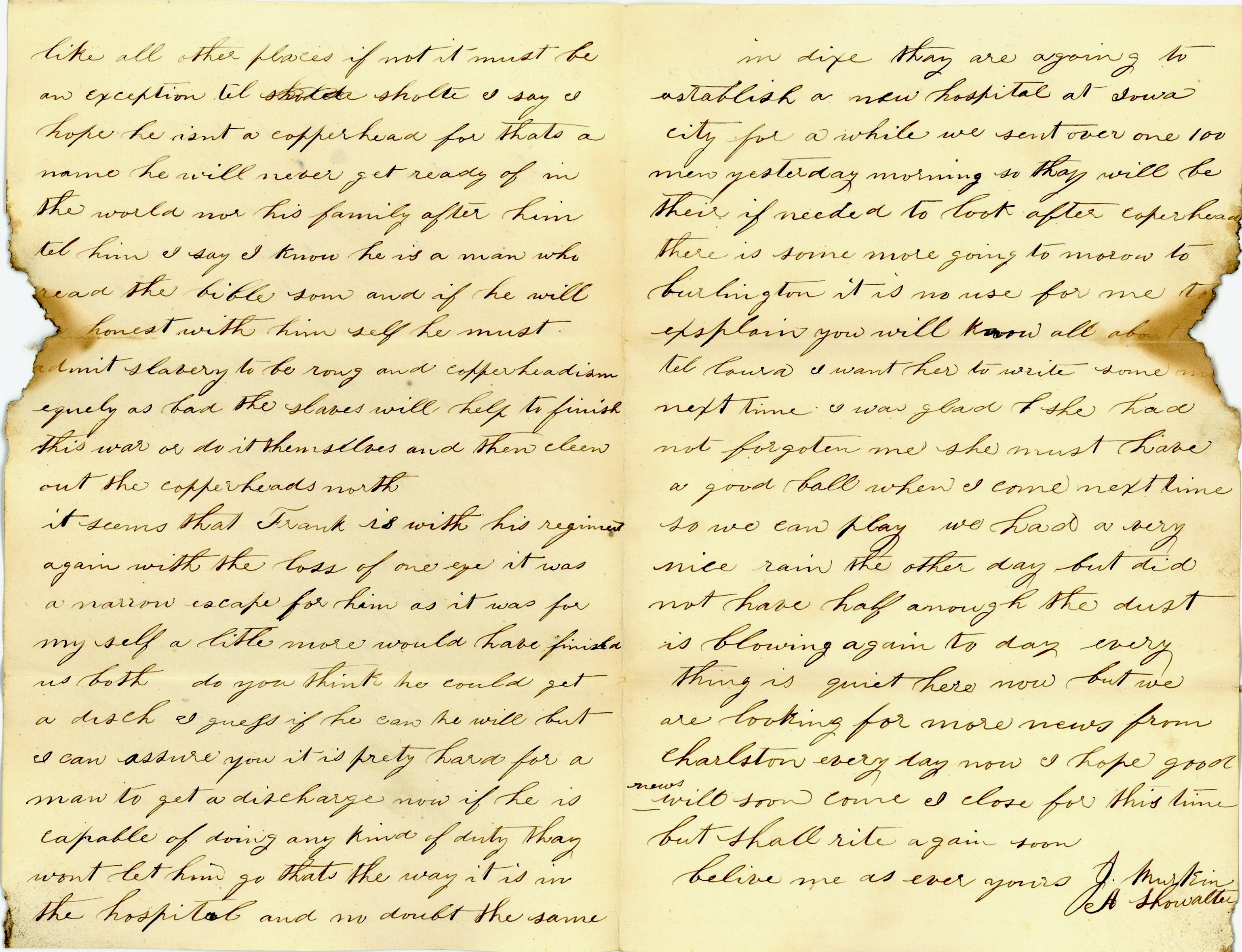 It seems that Frank is with his regiment again with the loss of one eye. It was a narrow escape for him as it was for myself. A little more would have finished us both. Do you think he could get a discharge? I guess if he can, he will, but I can assure you it is pretty hard for a man to get a discharge now. If he is capable of doing any kind of duty, they won’t let him go. That’s the way it is in the hospital and no doubt the same in Dixie. They are going to establish a new hospital at Iowa City for a while. We sent over one hundred men yesterday morning so they will be there if needed to look after Copperheads. There is some more going tomorrow to Burlington. It is no use for me to explain. You will know all about it.