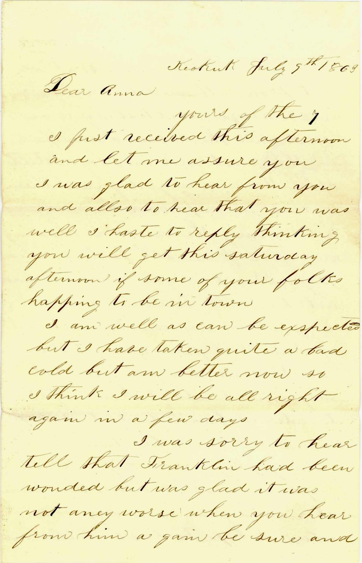 I was sorry to hear tell that Franklin had been wounded but was glad it was not worse. When you hear from him again, be sure and write and let me know how he is getting along.