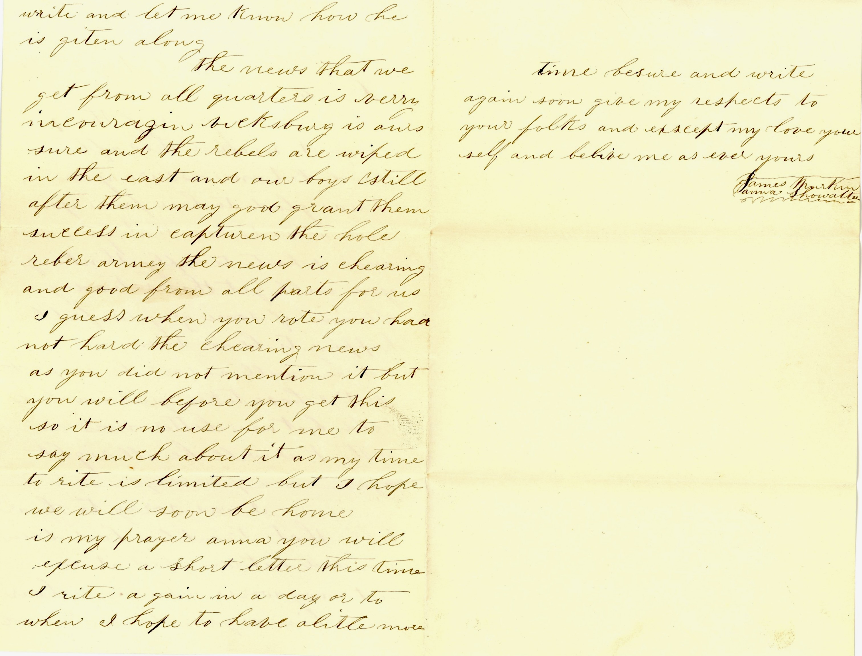 The news that we get from all quarters is very encouraging. Vicksburg is ours sure, and the rebels are whipped in the East and our boys still after them. May God grant them success in capturing the whole rebel army. The news is cheering and good from all parts for us. I guess when you wrote, you had not heard the cheering news as you did not mention it but you will before you get this, so it is no use for me to say much about it as my time to write is limited, but I hope we will soon be home is my prayer.