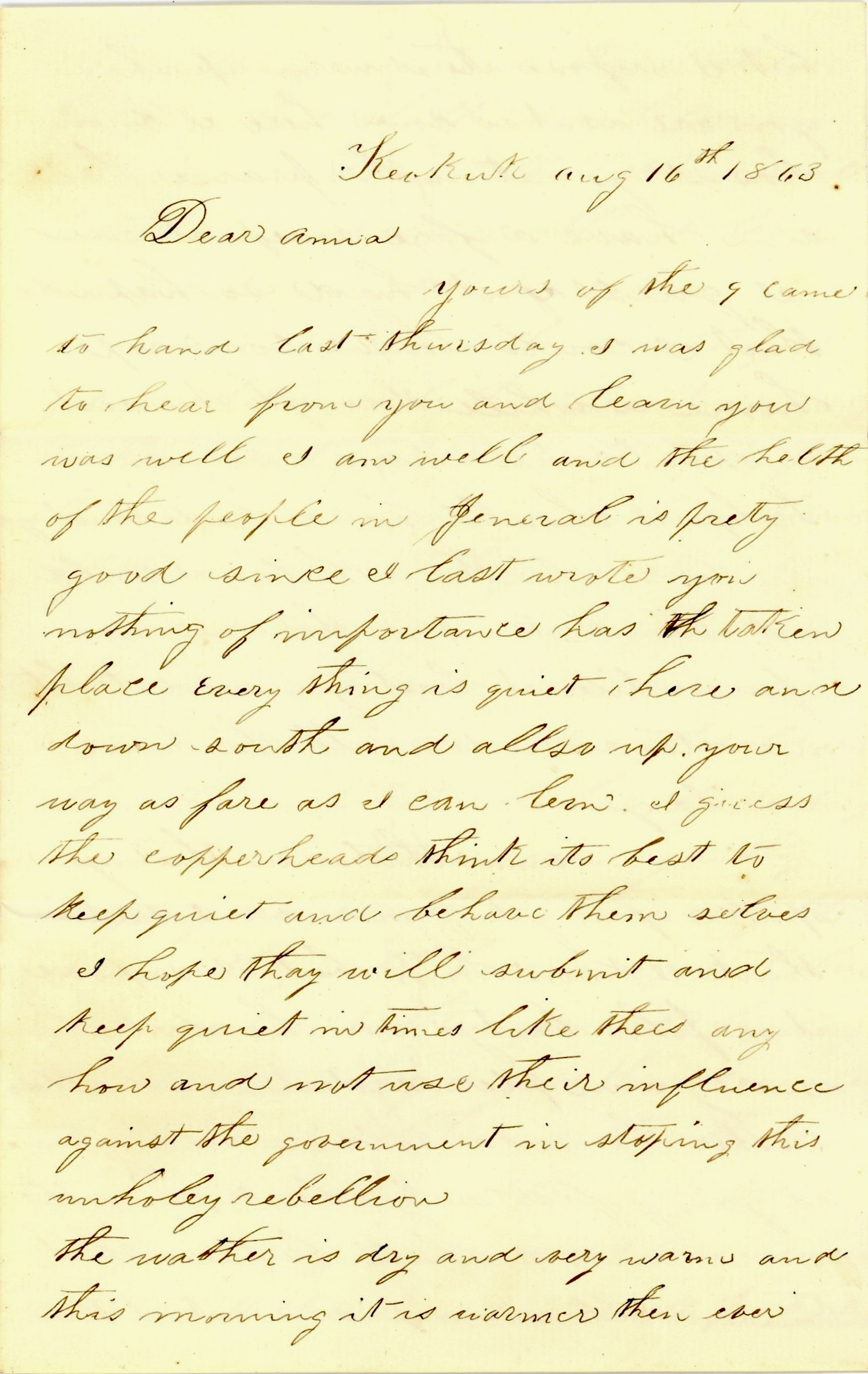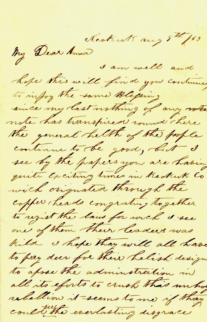 Since I last wrote you, nothing of importance has taken place. Everything is quiet here and down south and also up your way as far as I can learn. I guess the Copperheads think it’s best to keep quiet and behave themselves. I hope they will submit and keep quiet in times like these anyhow and not use their influence against the government in stopping this unholy rebellion.