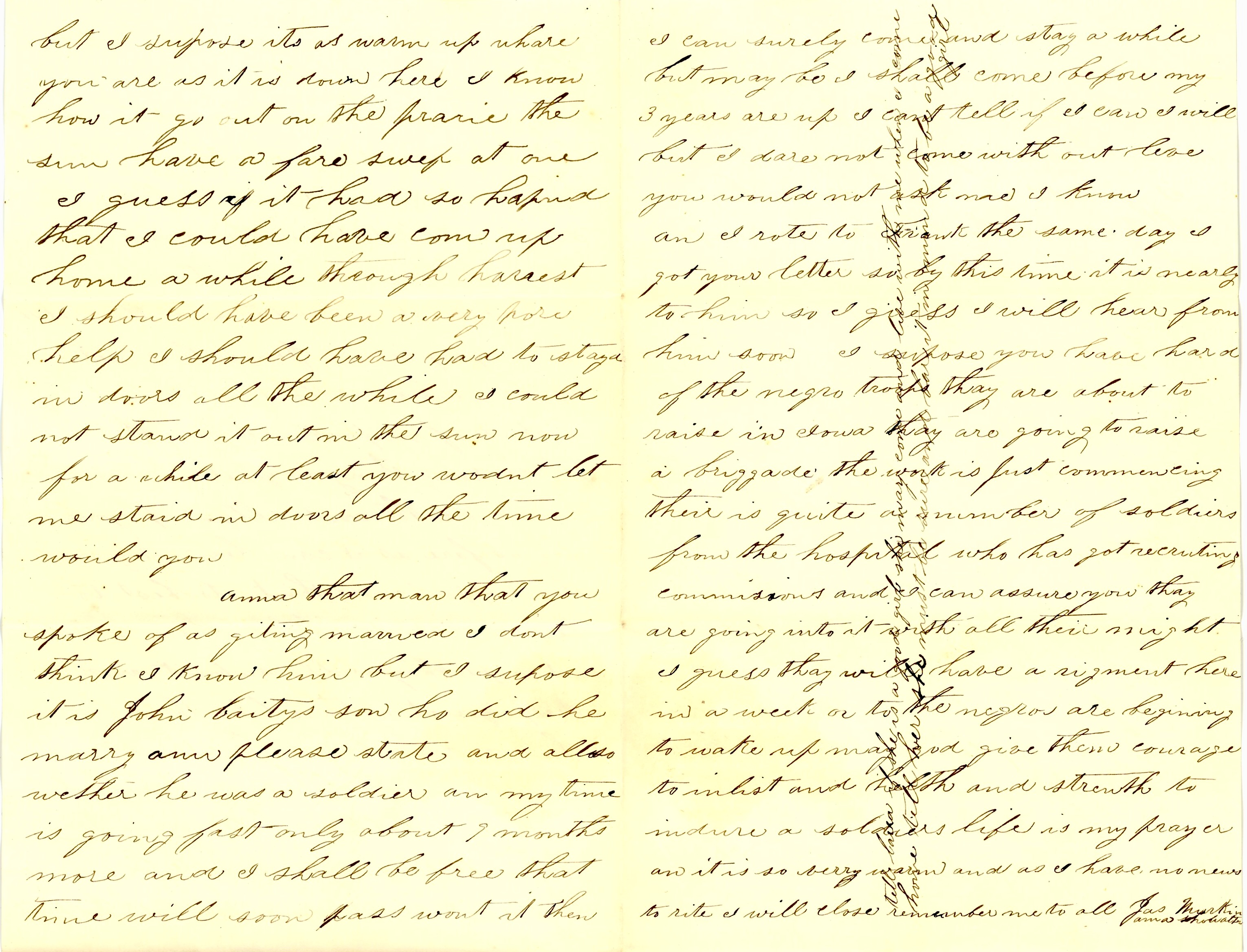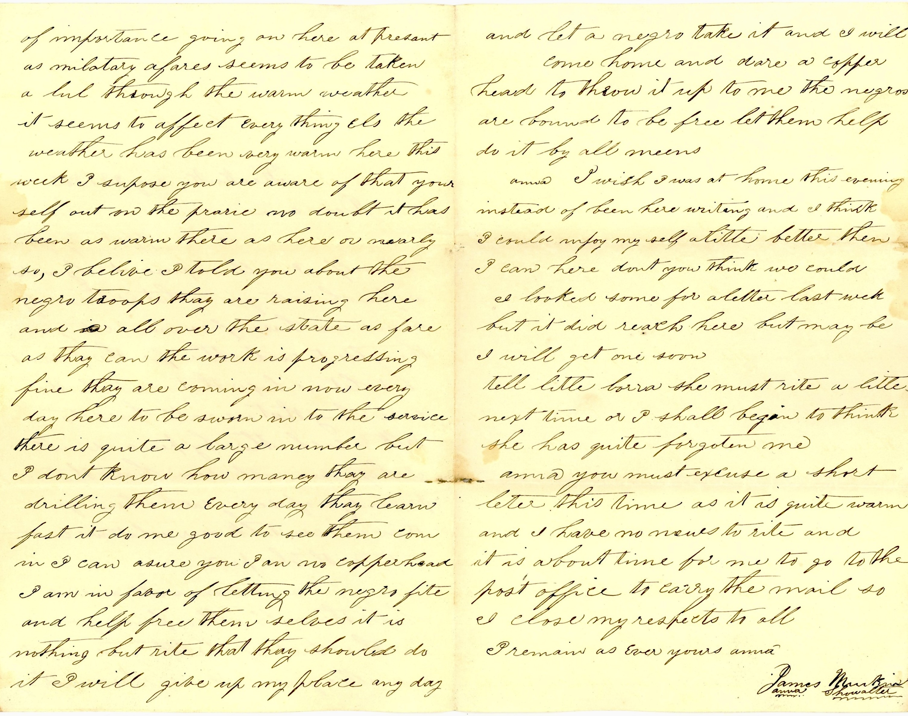 I believe I told you about the negro troops they are raising here and all over the state as fair as they can work is progressing fine. They are coming in now every day here to be sworn into the service. There is quite a large number but I don’t know how many. They are drilling them every day. They learn fast. It does me good to see them come in. I can assure you, I am no Copperhead. I am in favor of letting the negro fight and help free themselves. It is nothing but right that they should do it. I will give up my place any day and let a negro take it and I will come home and dare a Copperhead to throw it up to me. The negroes are bound to be free. Let them help do it by all means.
