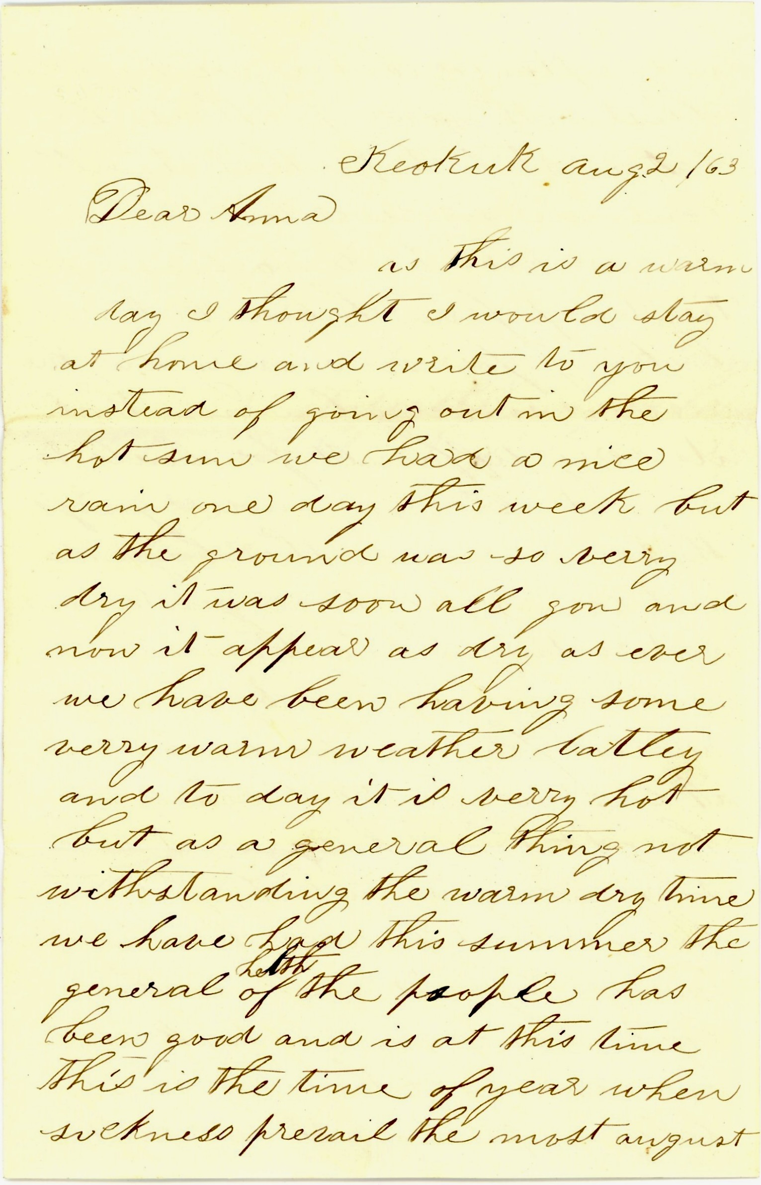 As this is a warm day, I thought I would stay at home and write to you instead of going out in the hot sun. We had a nice rain one day this week but as the ground was so very dry, it was soon all gone. And now it appears as dry as ever. We have been having some warm weather lately and today it is very hot. But as a general thing, notwithstanding the warm, dry time we have had this summer, the general health of the people has been good and is at this time. This is the time of the year when sickness prevails the most—August and September—but as we have been blessed with good health so far, let us still hope that it will continue.