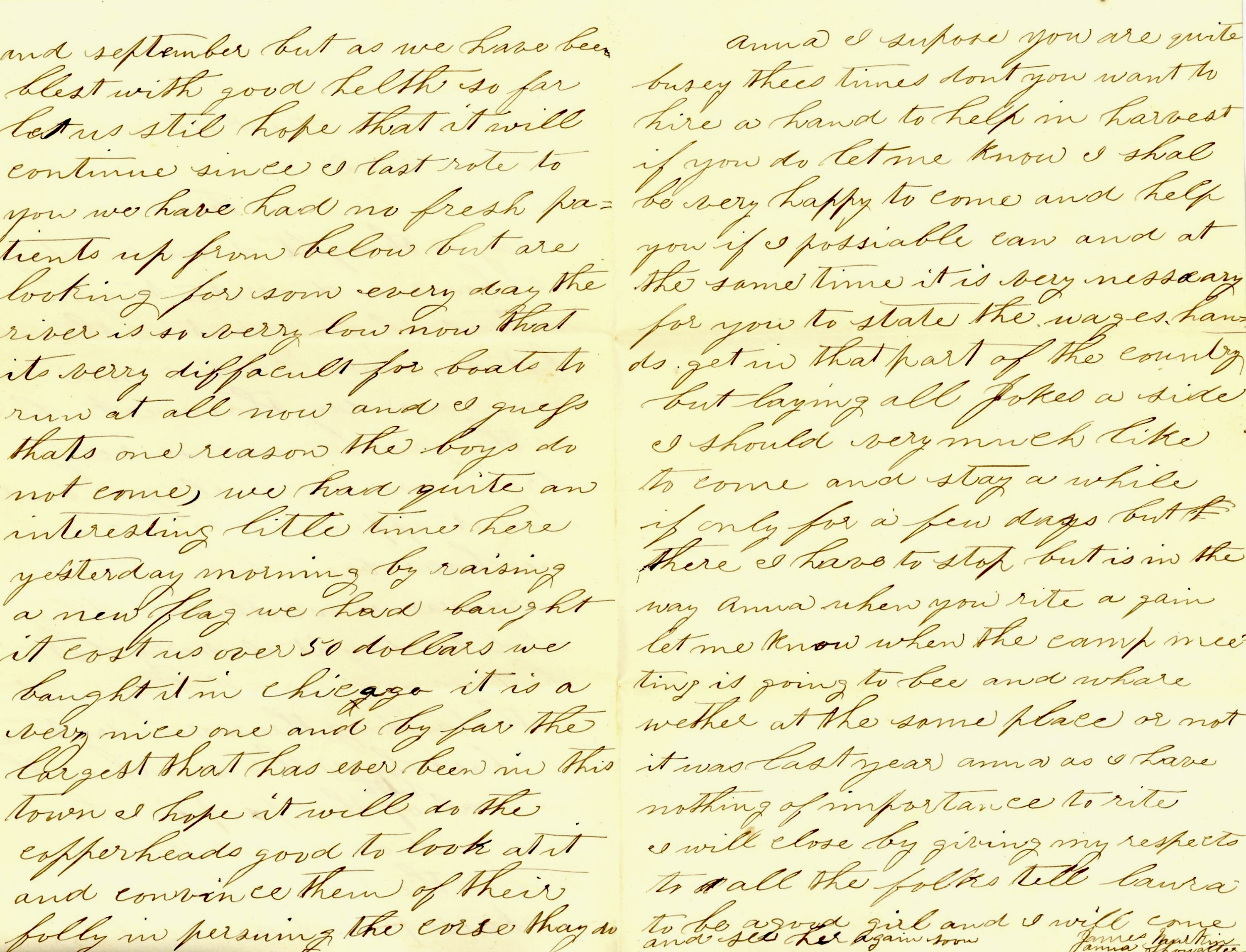 Anna, I suppose you are quite busy these times. Don’t you want to hire a hand to help in harvest. If you do, let me know. I shall be very happy to come and help you if I possibly can and at the same time it is very necessary for you to state the wages hands get in that part of the country. But laying all jokes aside, I should very much like to come and stay awhile if only for a few days. But there, I have to stop.