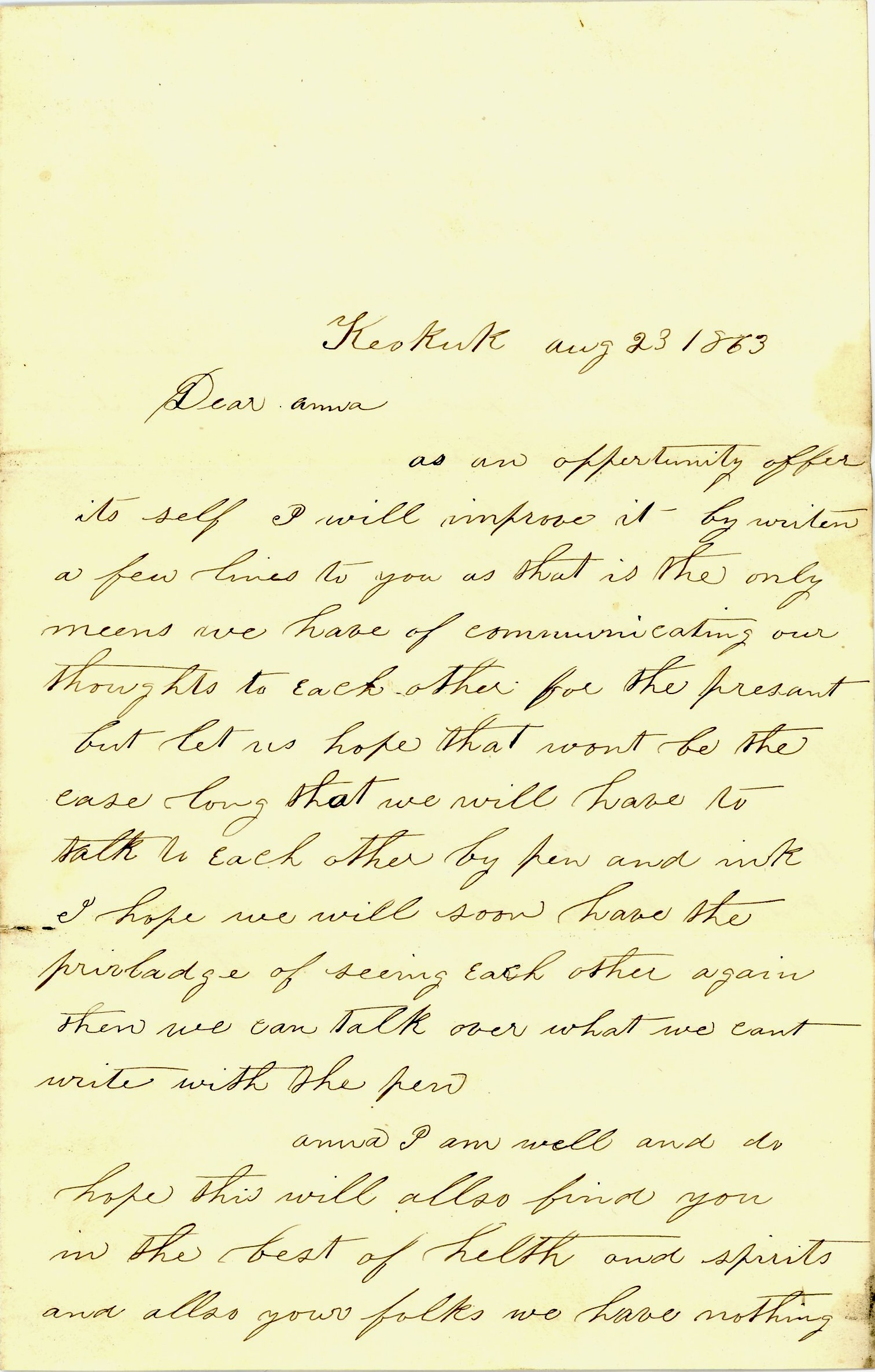 As an opportunity offers itself, I will improve it by writing a few lines to you as that is the only means we have of communicating our thoughts to each other for the present. But let us hope that won’t be the case long that we will have to talk to each other by pen and ink. I hope we will soon have the privilege of seeing each other again. Then we can talk over what we can’t write with the pen.