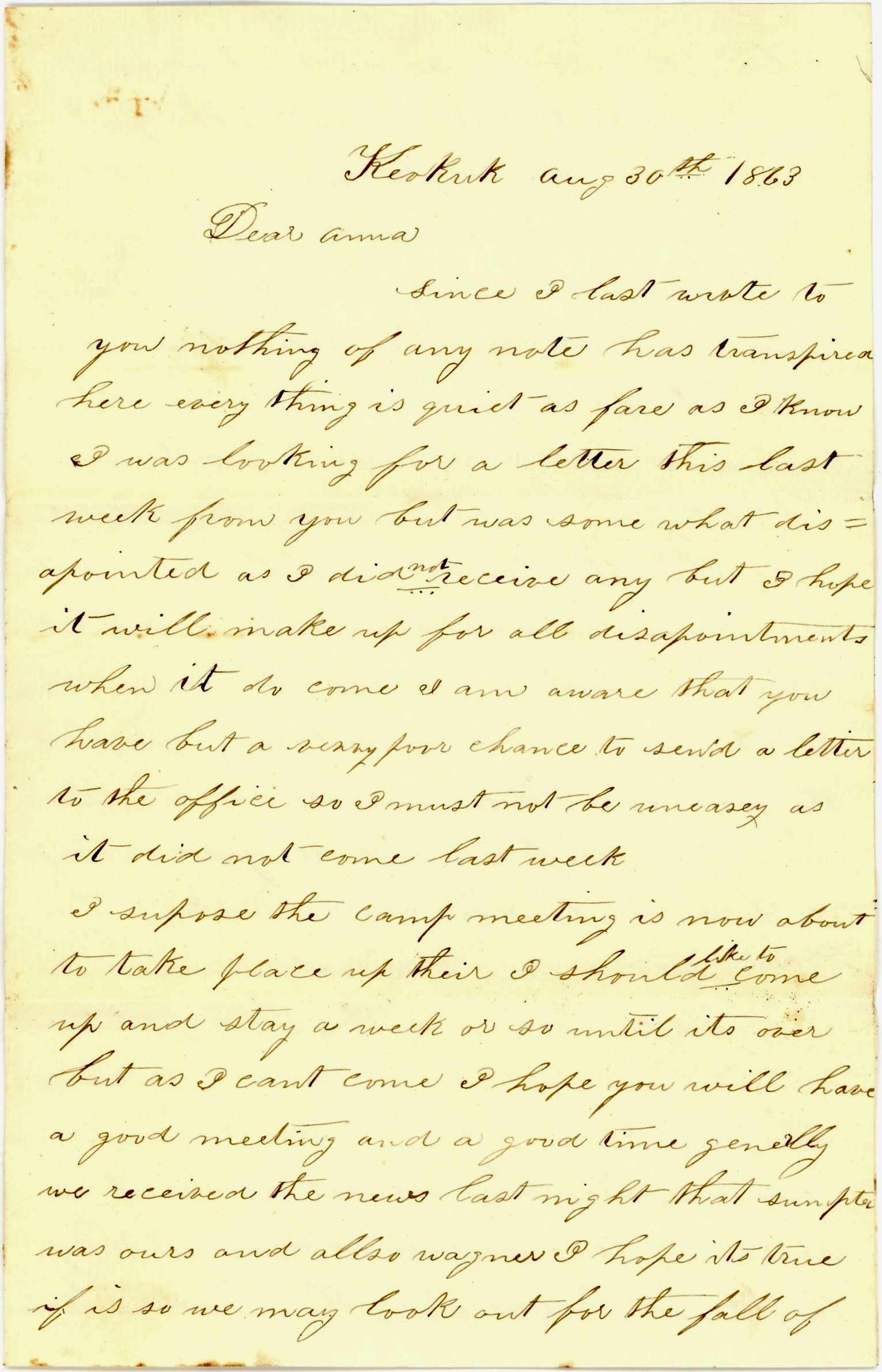 Anna, I am well and do hope this will also find you in the best of health and spirits and also your folks. We have nothing of importance going on here at present as military affairs seem to be taken a lull through the warm weather. It seems to affect everything else. The weather has been very warm here this week. I suppose you are aware of that yourself out on the prairie. No doubt it has been as warm there as here, or nearly so.
