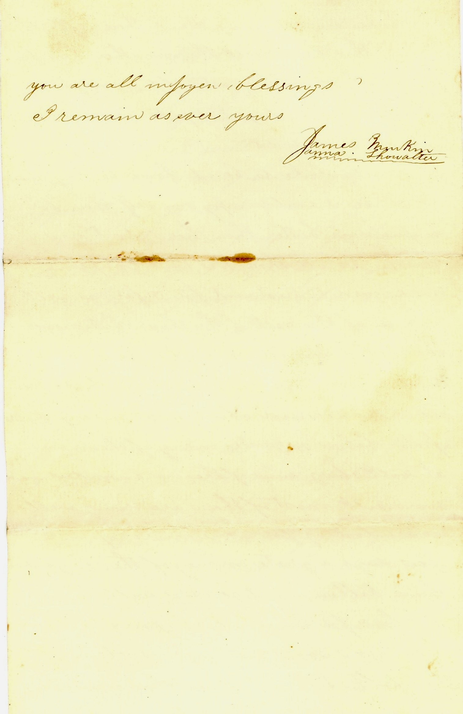 Anna, I don’t know as I have anything more to say at this time—only write as often as you can conveniently do so. Remember me kindly to all your folks and believe me as ever affectionately yours. — Jas. Murkin