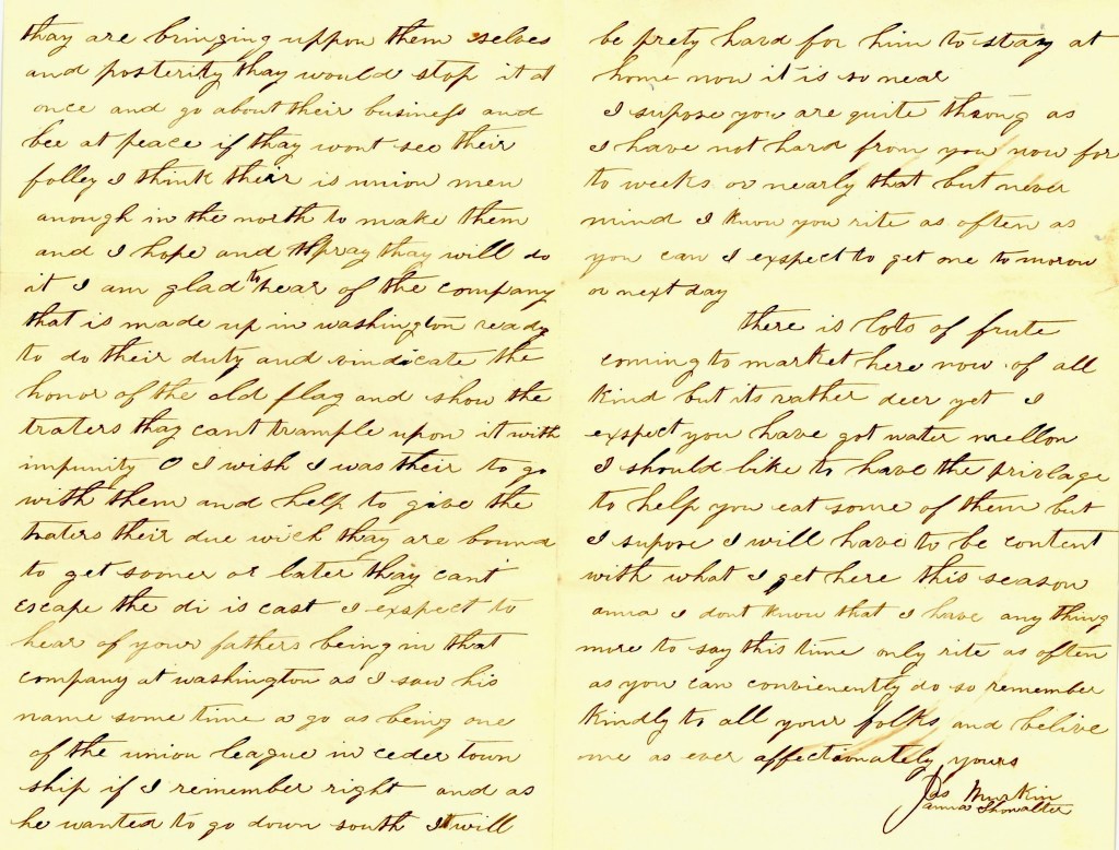 I am glad to hear of the company [the “Washington Provost Guards”] that is made up in Washington ready to do their duty and vindicate the honor of the old flag and show the traitors they can’t trample upon it with impunity. Oh I wish I was there to go with them and help to give the traitors their due which they are bound to get sooner or later. They can’t escape. The die is cast. I expect to hear of your Father’s being in that company at Washington as i saw his name some time ago as being one of the Union League in Cedar township, if I remember right, and as he wanted to go down south. It will be pretty hard for him to stay at home now it is so near.