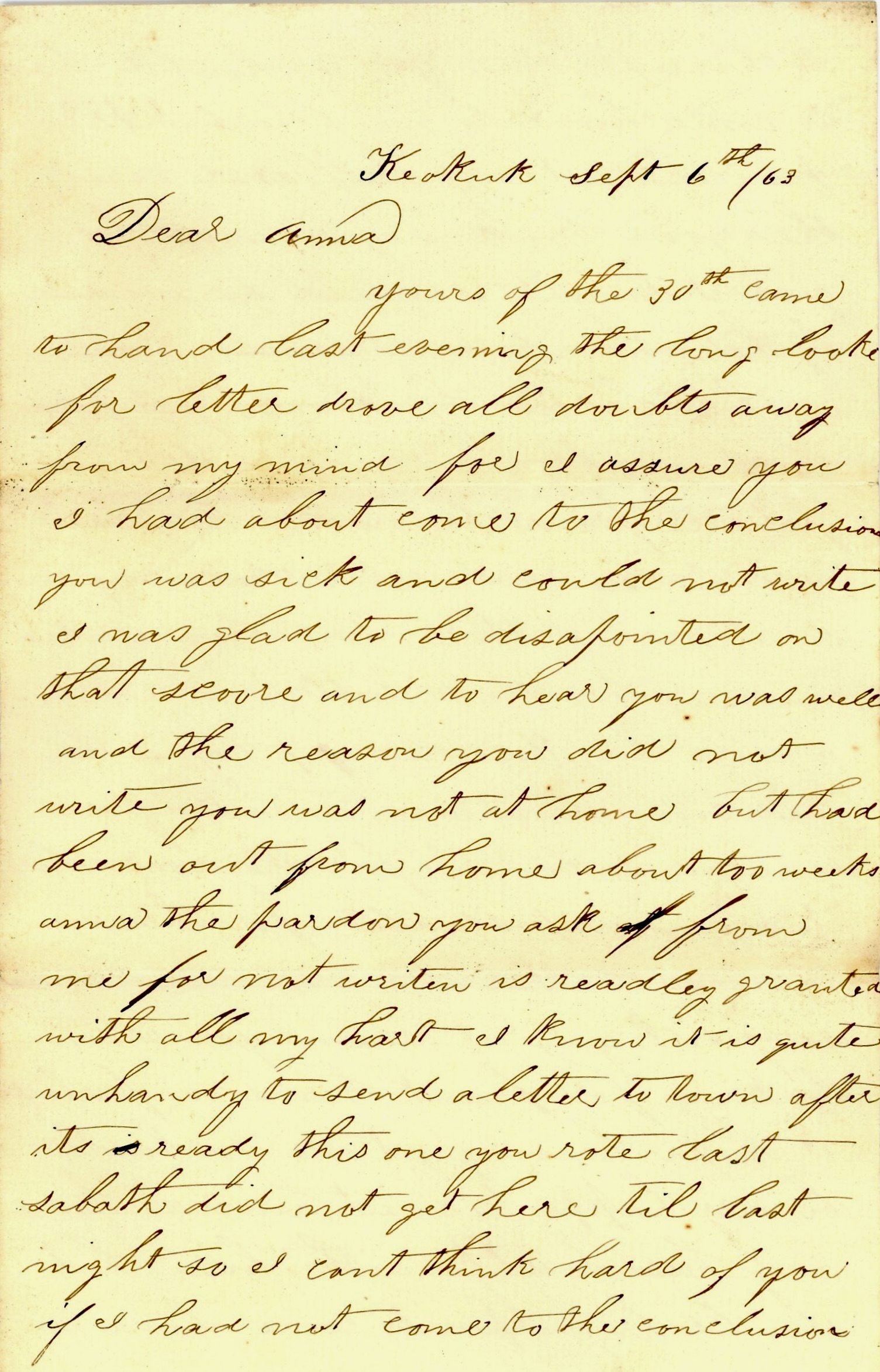 I suppose you will have heard about the taking of [Henry] Clay Dean here in Keokuk last Friday evening. That is true. You may rely on that as being so, He had been over in Illinois preaching treason no doubt and came over the river to this place to stay for the night and was going next day to a town in the country to make another speech but the boys thought best to keep him here awhile. So they went to the house where he was staying at and took charge of him and he is now in the guard house. He will have a trial. You will hear the result in due time. If he gets what he ought to have, and what he no doubt richly deserves, I think he won’t bother Iowa anymore for awhile at any rate with his treason.