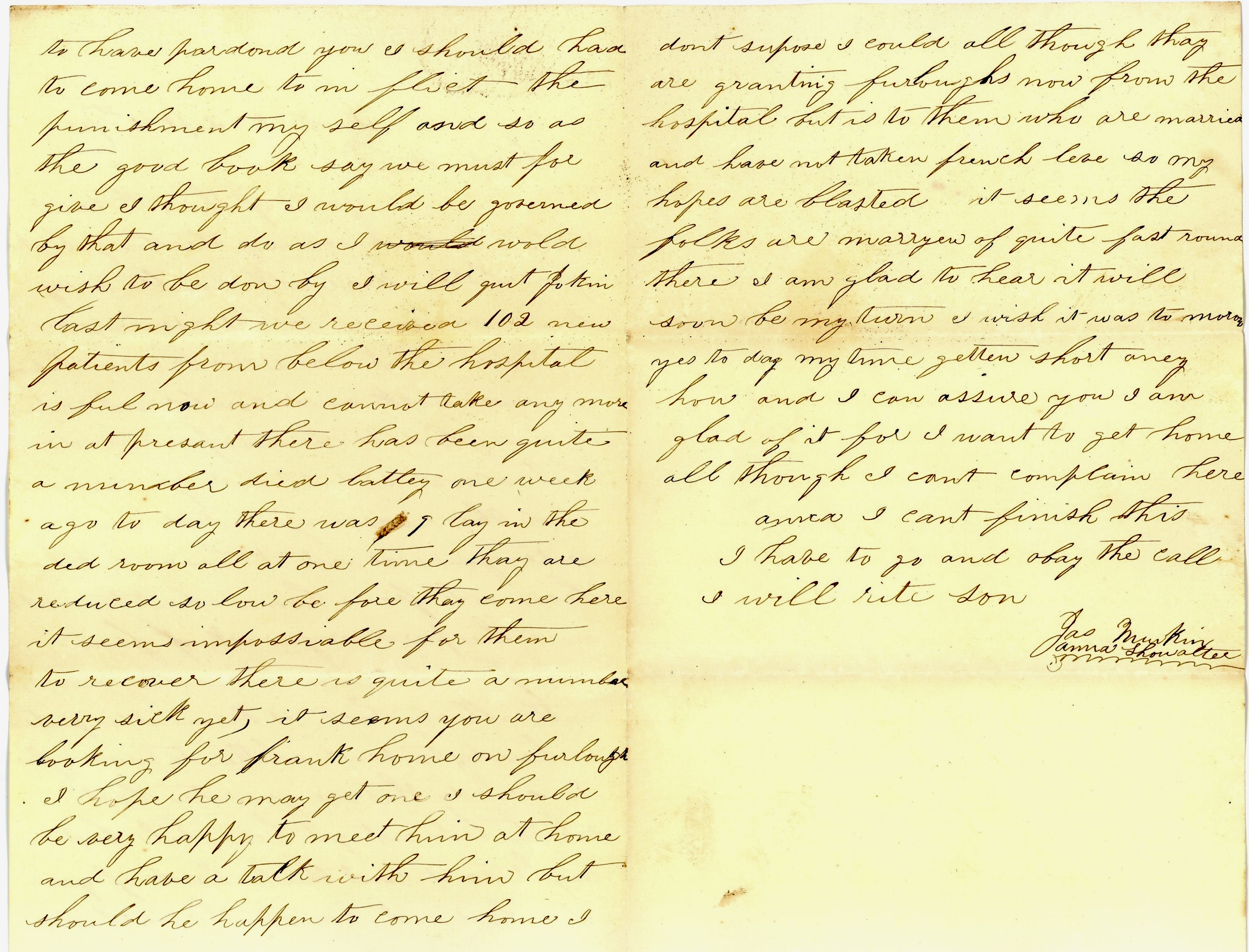 It seems you are looking for Frank home on furlough. I hope he may get one. I should be very happy to meet him at home and have a talk with him but should he happen to come home, I don’t suppose I could although they are granting furloughs now from the hospital. But it is to them who are married and have not taken French leave so my hopes are blasted. It seems the folks are marrying off quite fast round there, I am glad to hear. It will soon be my turn. I wish it was tomorrow. Yes, today. My time is getting short anyhow… I will write soon. — Jas Murkin