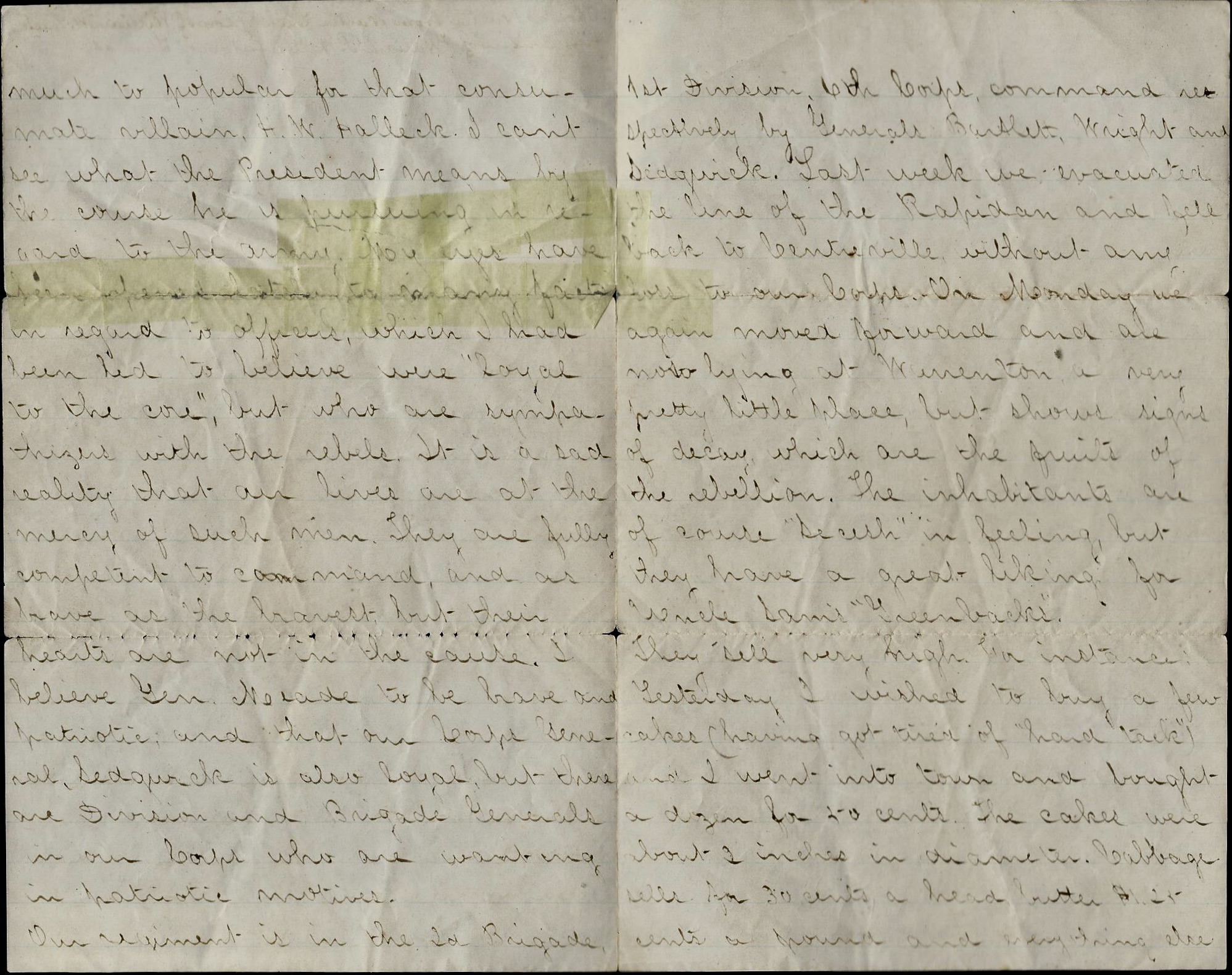 Last week we evacuated the line of the Rapidan and fell back to Centreville without any loss to our Corps. On Monday we again moved forward and are now lying at Warrenton—a very pretty little place, but shows signs of decay which are the fruits of the rebellion. The inhabitants are of course “Secesh” in feeling, but they have a great liking for Uncle Sam’s “greenbacks.” They sell very high. For instance, yesterday I wished to buy a few cakes (having got tired of hard tack) and I went into town and bought a dozen for 50 cents. The cakes were about two inches in diameter. Cabbage sells for 30 cents a head, butter $1.25 cents a pound and everything else in proportion.