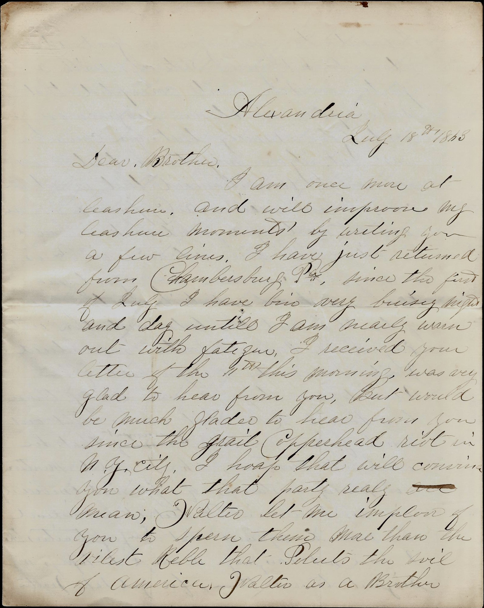 I am once more at leisure and will improve my leisure moments by writing you a few lines. I have just returned from Chambersburg, Pa. Since the first of July I have been very busy night and day until I am nearly worn out with fatigue. I received your letter of the 11th this morning. Was very glad to hear from you but would be much gladder to hear from you since the great Copperhead riot in New York City. I hope that will convince you that that party really mean.