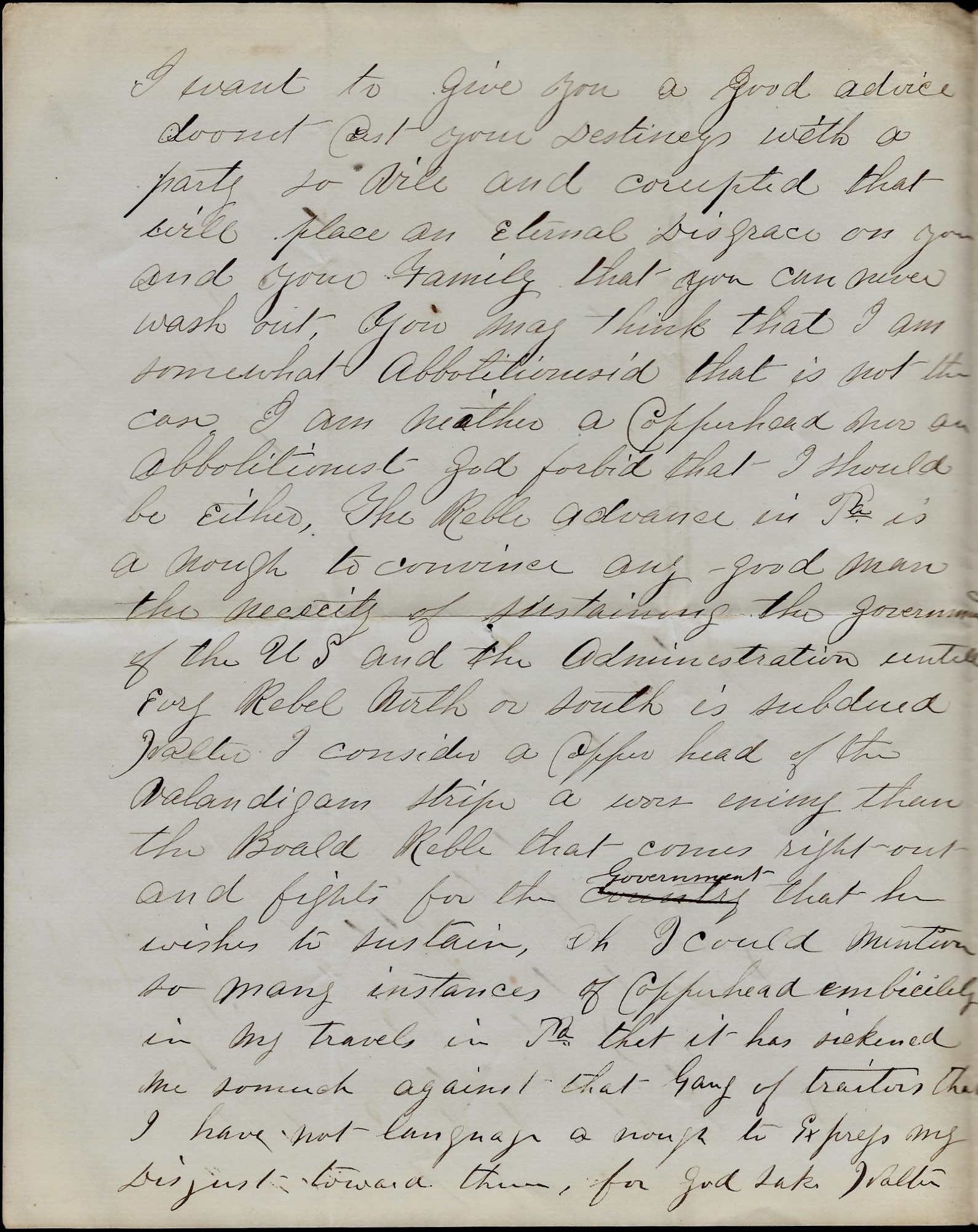 Walter, let me implore of you to spurn them more than the vilest Rebel that pollutes the soil of America. Walter, as a brother, I want to give you a good advice. Don’t cast your destinies with a party so vile and corrupted that will place an eternal disgrace on you and your family that you can never wash out. You may think that I am somewhat abolitionized. That is not the case. I am neither a Copperhead nor an Abolitionist. God forbid that I should be either. The Rebel advance in Pennsylvania is enough to convince any good man the necessity of sustaining the government of the United States and the Administration until every Rebel North or South is subdued.