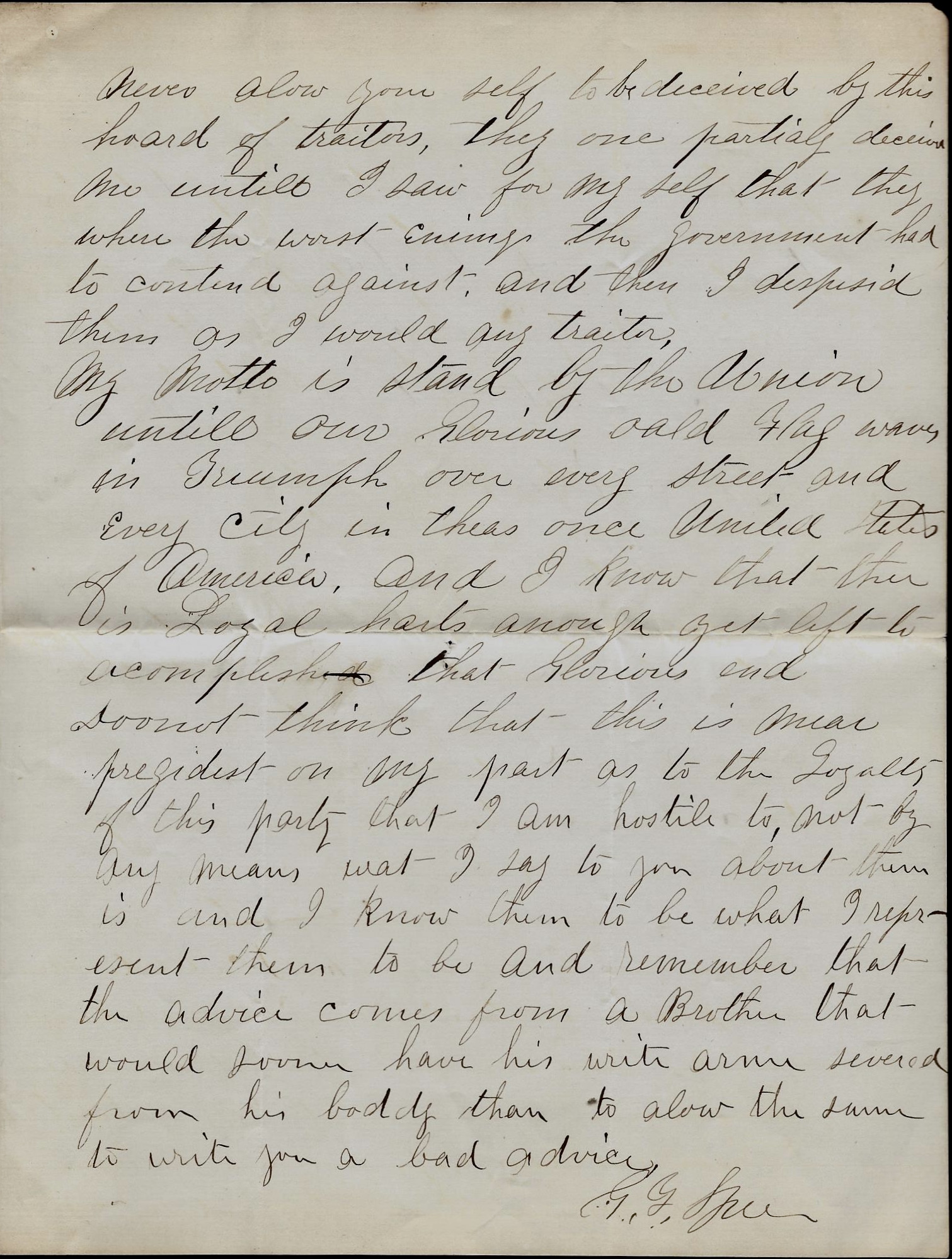 My motto is Stand by the Union until our glorious Old Flag waves in triumph over every street and every city in these once United States of America. And I know that there is loyal hearts enough yet left to accomplish that glorious end. Do not think that this is mere prejudice on my part as to the loyalty of this party that I am hostile to—not by any means. What I say to you about them is [true] and I know them to be what I represent them to be. And remember that the advice comes from a brother that would sooner have his right arm severed from his body than to allow the same to write you a bad advice. — G. F. Speer