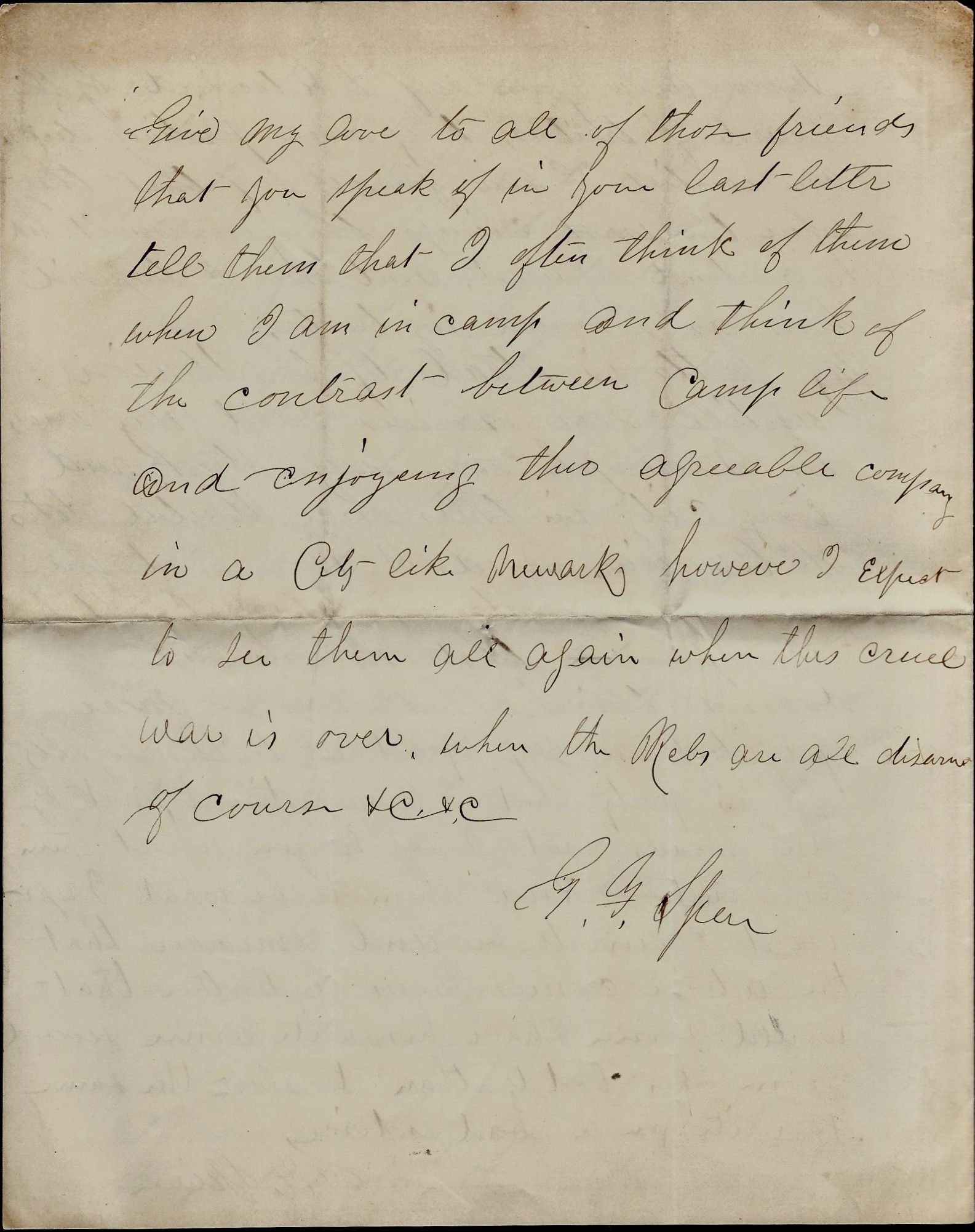 Give my love to all of those friends that you speak of in your last letter. Tell them that I often think of them when I am in camp and think of the contrast between camp life and enjoying their agreeable company in a city like Newark. However, I expect to see them all again when this cruel war is over. When the Rebs are all disarmed of course, &c. &c. — G. F. Speer
