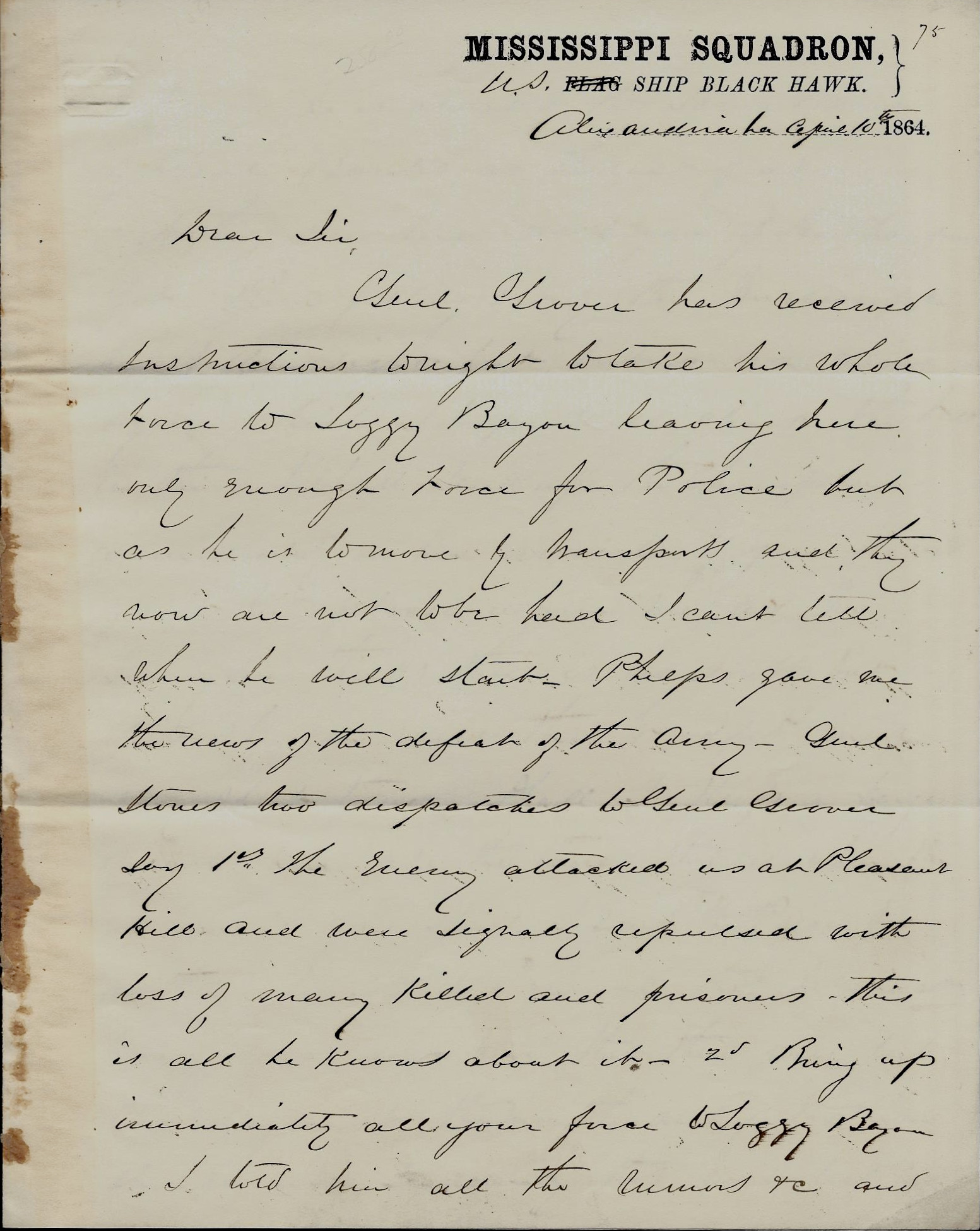 Commander Breese wrote this letter from Alexandria, Louisiana, while on the Red River Expedition. That expedition was a failure as the annual rise in the Red River failed to materialize that year making it impossible for the Union’s heavy gunboats to pass over the rapids in the river. Breese’s letter refers to the battles of Sabine Crossroads and Pleasant Hill which were fought on 8 and 9 April 1864. The battles convinced Banks that his campaign against Shreveport should be abandoned. Though the battle of Pleasant Hill may have been a Northern victory, the retreat to Grand Ecore was a strategic defeat. In less than a week, the USS Black Hawk would be ordered to “Get out of the [Red] River whilst there is a chance.”