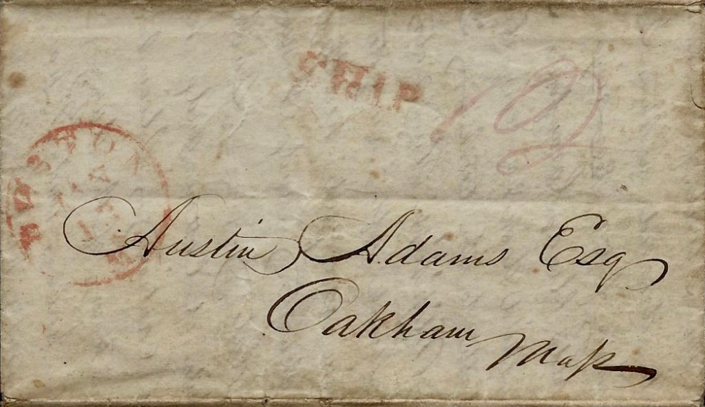I shall send this by the ship Carolina to Boston, which sails tomorrow, thence to Oakham by mail which is all will cost you for ship 06, mail 10 = 16 which is cheap enough.