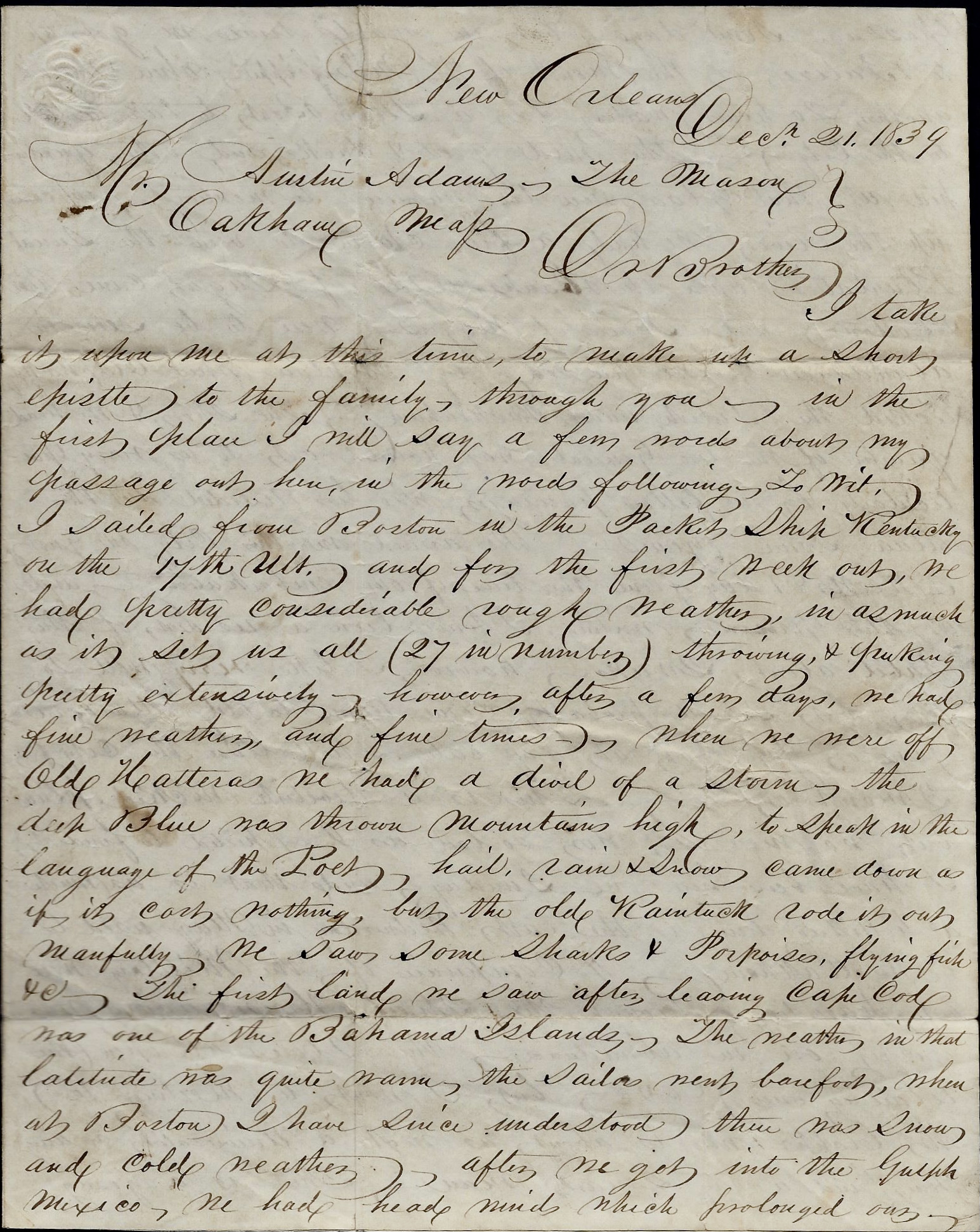 This letter was written by Lyman Adams (1815-1859), the son of Dr. Charles Adams and Sarah McAllister (17901868) of Oakham, Massachusetts. The letter was datelined from New Orleans in late December 1839, less than two weeks after his arrival in the Crescent City and captures his first impressions of the city and its inhabitants.