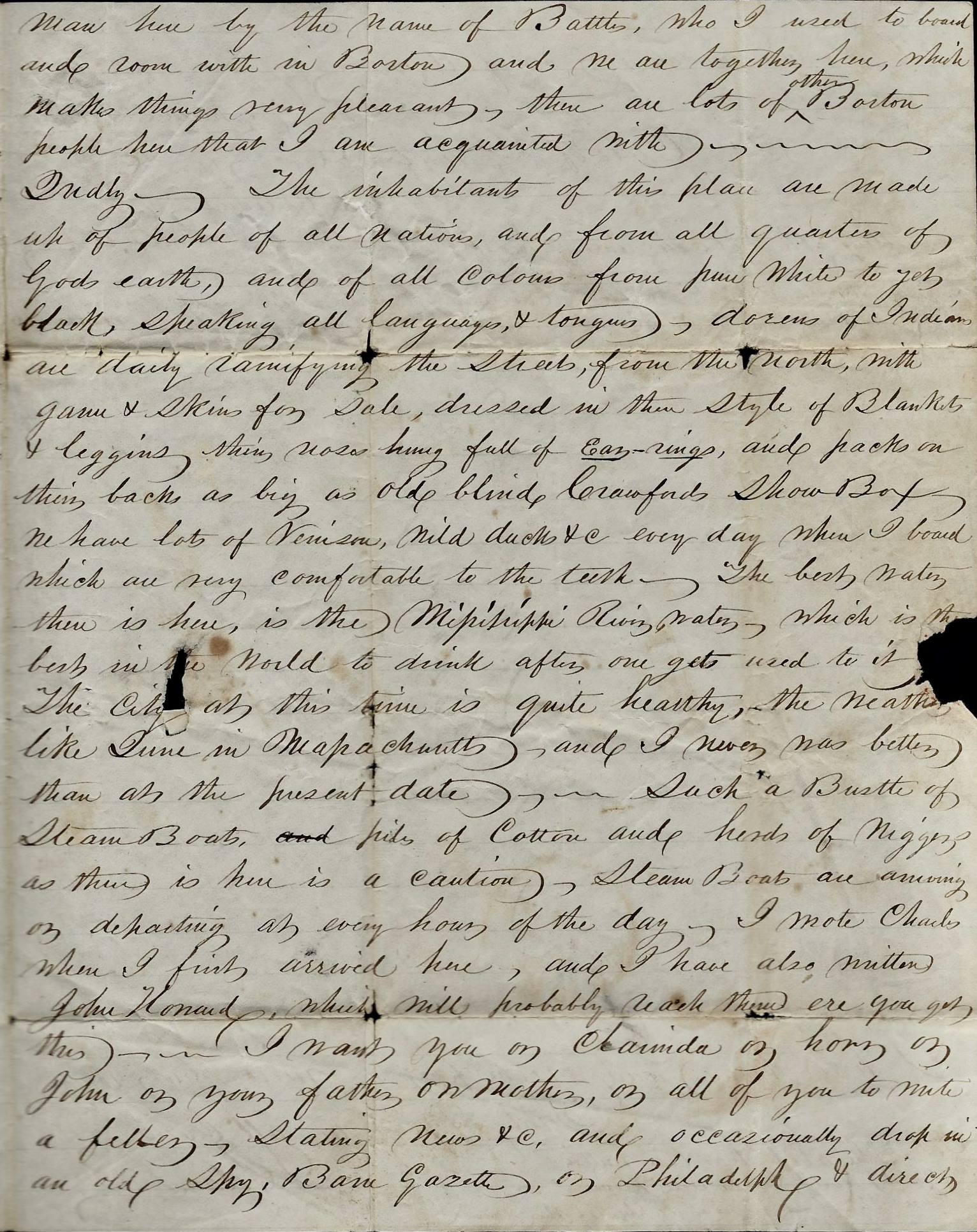 Secondly, the inhabitants of this place are made up of people of all Nations, and from all quarters of God’s earth, and of all colours from White to jet black, speaking all languages & tongues, dozens of Indians are daily ramifying the streets from the north with game and skins for sale, dressed in the style of blankets & leggins, thin noses hung full of ear-rings, and packs on their backs as big as old blind Crawford’s Show Box. We have lots of venison, wild ducks &c. every day where I board which are very comfortable to the teeth. The best water there is here is the Mississippi River water which is the best in the world to drink after one gets used to it. The city at this time is quite healthy. The weather like June in Massachusetts and I never was better than at the present date.