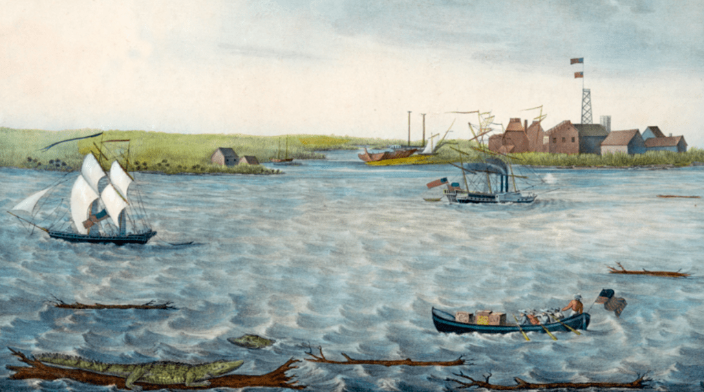 After we got into the Gulf of Mexico, we had head winds which prolonged our passage some days but in good time we got to [La] Balize or the mouth of the Mississippi where we laid another 20 hours waiting for a steamboat to take us up to the city. The wild geese and ducks and other quadrupeds at that place were too numerous to mention. In coming up the river, we had a fine chance to view the several plantations upon the banks, fields of sugar cane, rice and cotton, and scores of niggers were to be seen in abundance. We passed by the place where Old Hickory licked the British under Packenham. The spot and the headquarters of the two generals was pointed out to us very particularly by a fellow passenger who has resided in this place some years.