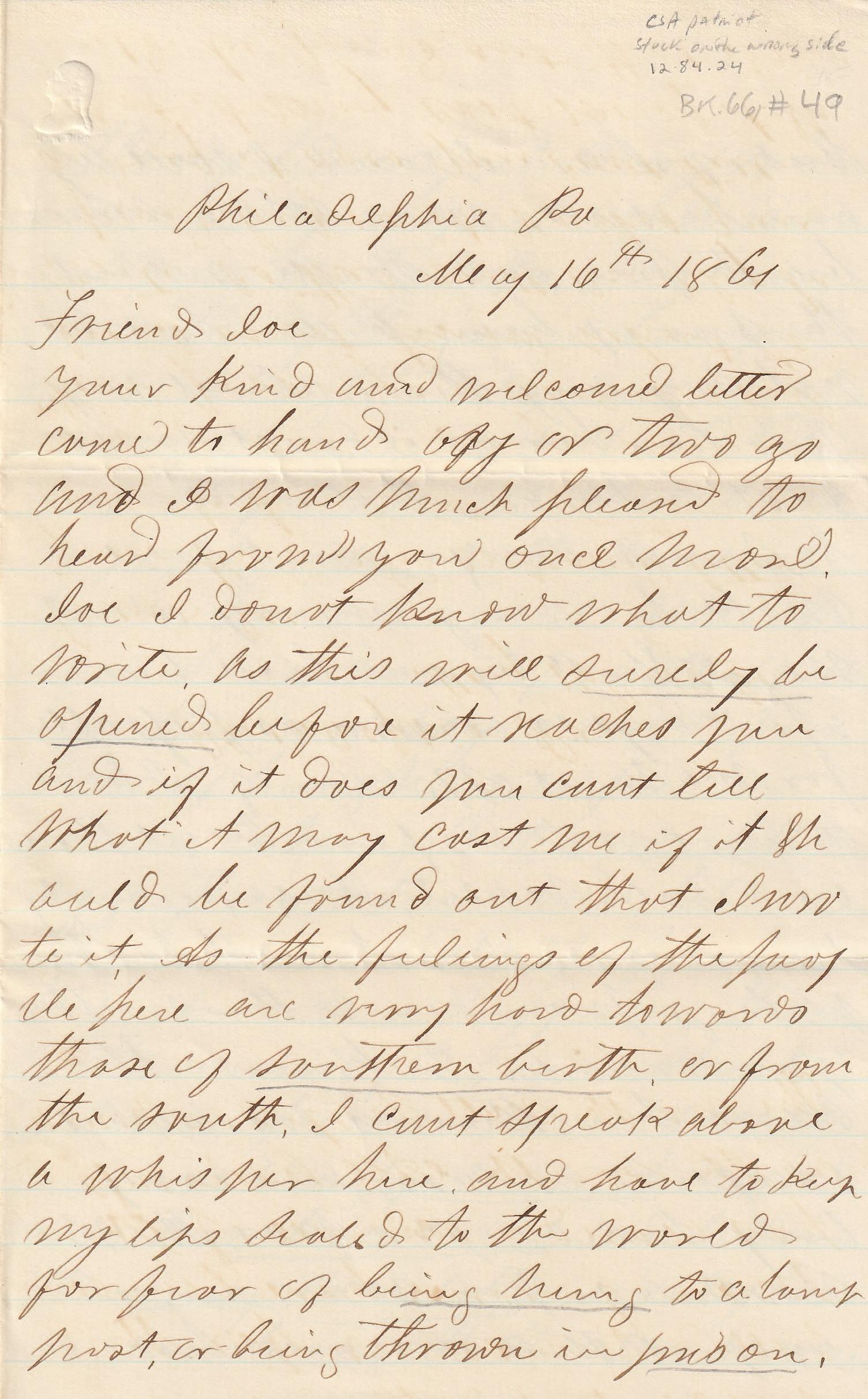 The identity of the author of this letter was intentionally concealed by the writer claiming that he feared for his life. The author datelined his letter from Philadelphia where we learn that he was a Southerner by birth and awaiting an opportunity to flee the city and return to the South before he might be “hung to a lamp post” or “thrown in prison.” He datelined his letter on 16 May 1861, over a month after the firing on Fort Sumter, but before all mail service to, from, and within the Confederate States was suspended on 31 May 1861 by US Postmaster General, Montgomery Blair.