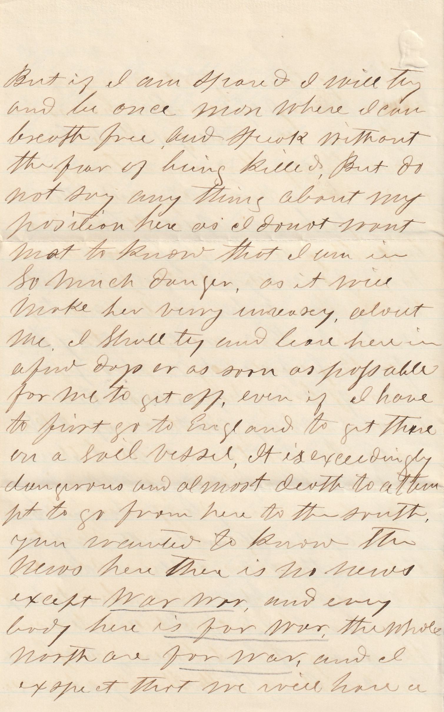 But do not say anything about my position here as I don’t want Mat to know that I am in so much danger as it will make her very uneasy about me. I shall try and leave here in a few days or as soon as possible for me to get off, even if I have to first go to England to get there on a sail vessel. It is exceedingly dangerous and almost death to attempt to go from here to the South.