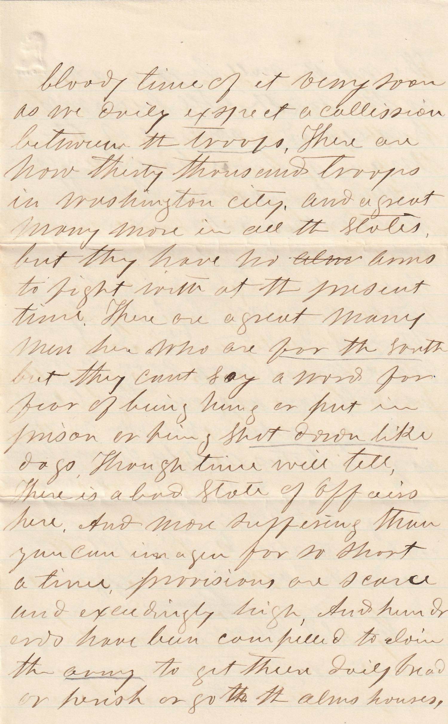 You wanted to know the news here. There is no news except war, war, and everybody here is for war. The whole North are for war and I expect that we will have a bloody time of it very soon as we daily expect a collision between the troops. There are now thirty thousand troops in Washington City and a great many more in all the States but they have no arms to fight with at the present time.