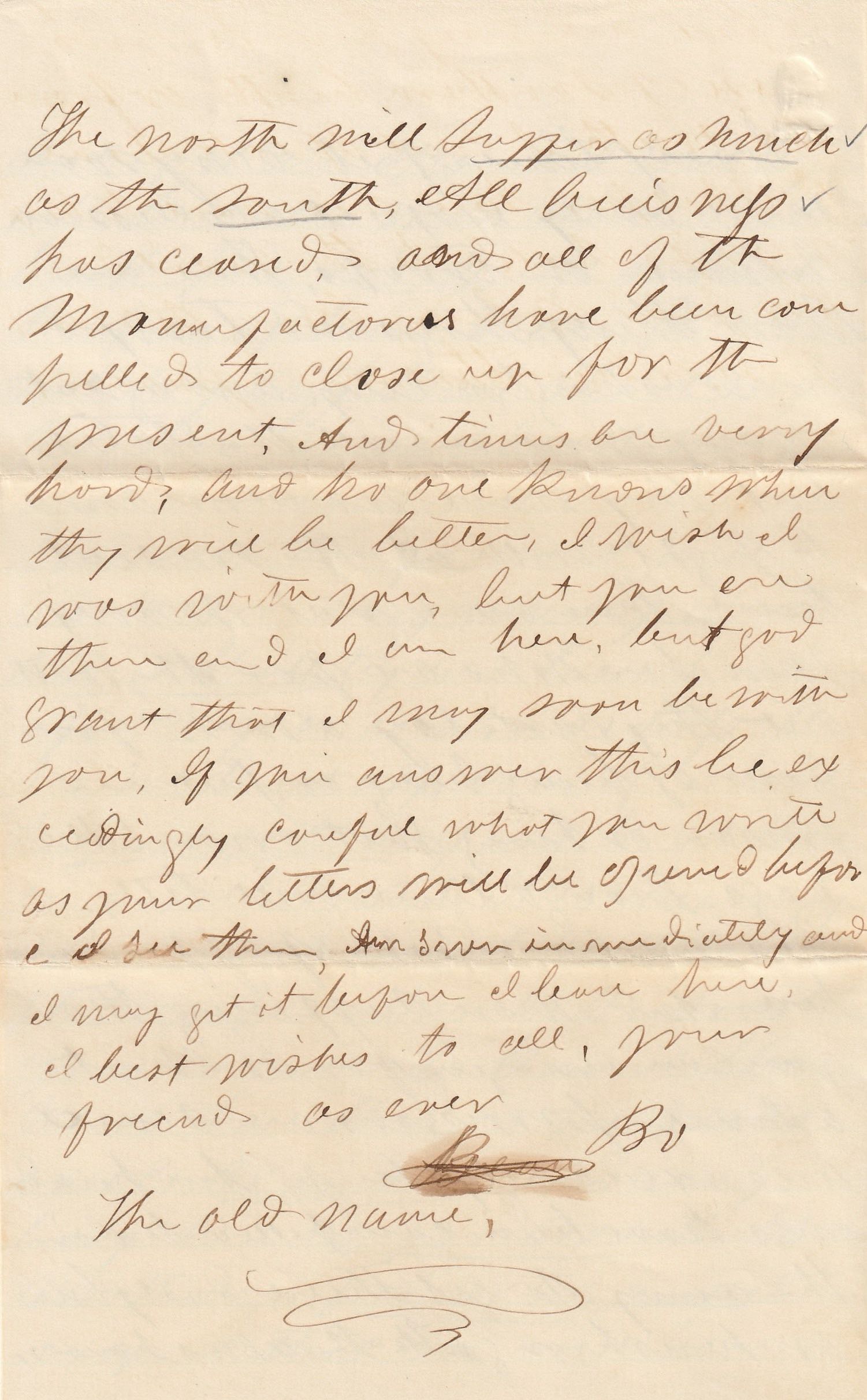 There are a great many men here who are for the South but they cannot say a word for fear of being hung or put in prison or being shot down like dogs. Though time will tell, there is a bad state of affairs here and more suffering than you can imagine for so short a time. Provisions are scarce and exceedingly high. And hundreds have been compelled to join the army to get their daily bread or perish or go to the alms houses. The North will suffer as much as the South. All business has ceased and all of the manufacturers have been compelled to close up for the present. And times are very hard and no one knows when they will be better.