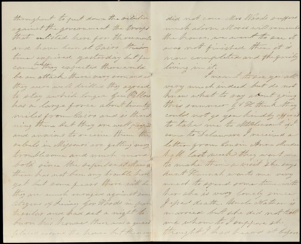 The North seems now to be united and the same feeling throughout to put down the rebellion against the government. The troops that enlisted here for three months and have been at Cairo, their time expired yesterday but few came back. They expected there would be an attack there very soon and as they were well drilled, they agreed to stay awhile longer. Gen. Pillow has a large force about twenty miles from Cairo and is threatening them but they are well prepared and anxious to receive them. The Rebels in Missouri are getting very troublesome and much more bold since the repulse at Manassas. There has not been any trouble here yet but some fears there will be. They are much enraged against some of the citizens of Quincy—Gov. Woods in particular—and had set a night to burn his house. There was a guard placed around the house but the enemy did not come. Mrs. Woods suffers much alarm. Moses will remember the house; he went to see it. It was not finished then. It is now completed and the family living in it.