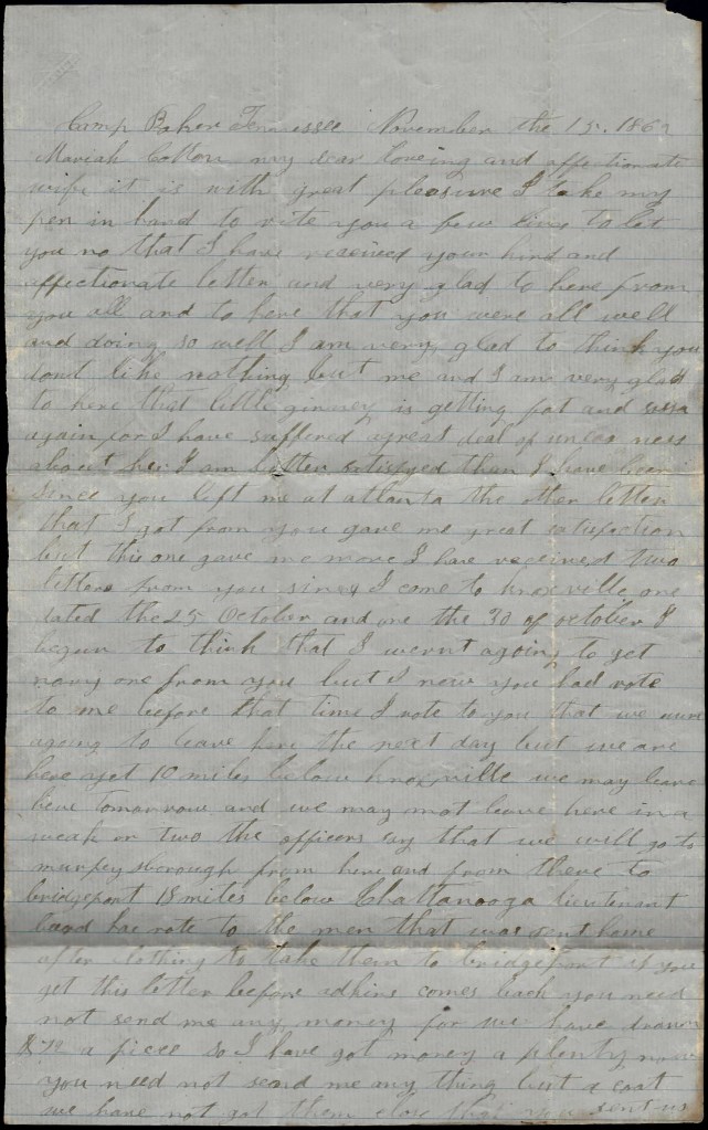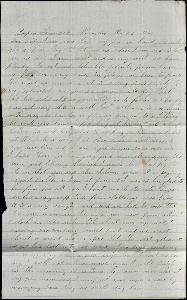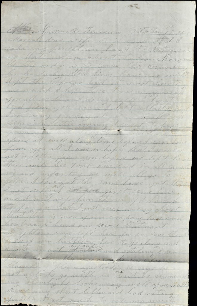 These lines leave me well and I hope these few lines may find you all the same. I was in hopes a few days ago that I would get to come home before long but this move knocked it in the head so I don’t have any idea when I will get the chance to come to see you all. Don’t get out of heart for I will come as soon as I can. Don’t be uneasy about me. I will be sure to take care of myself. Take care of yourself and our little children and don’t work yourself to death but enjoy yourself the best you can. I am in hopes I will get a letter from you tonight.