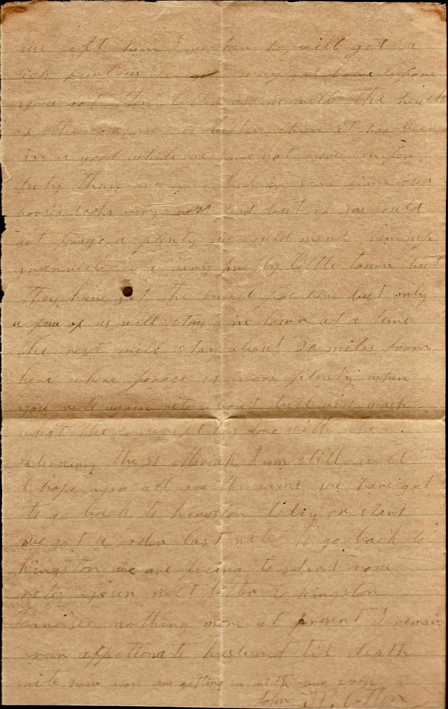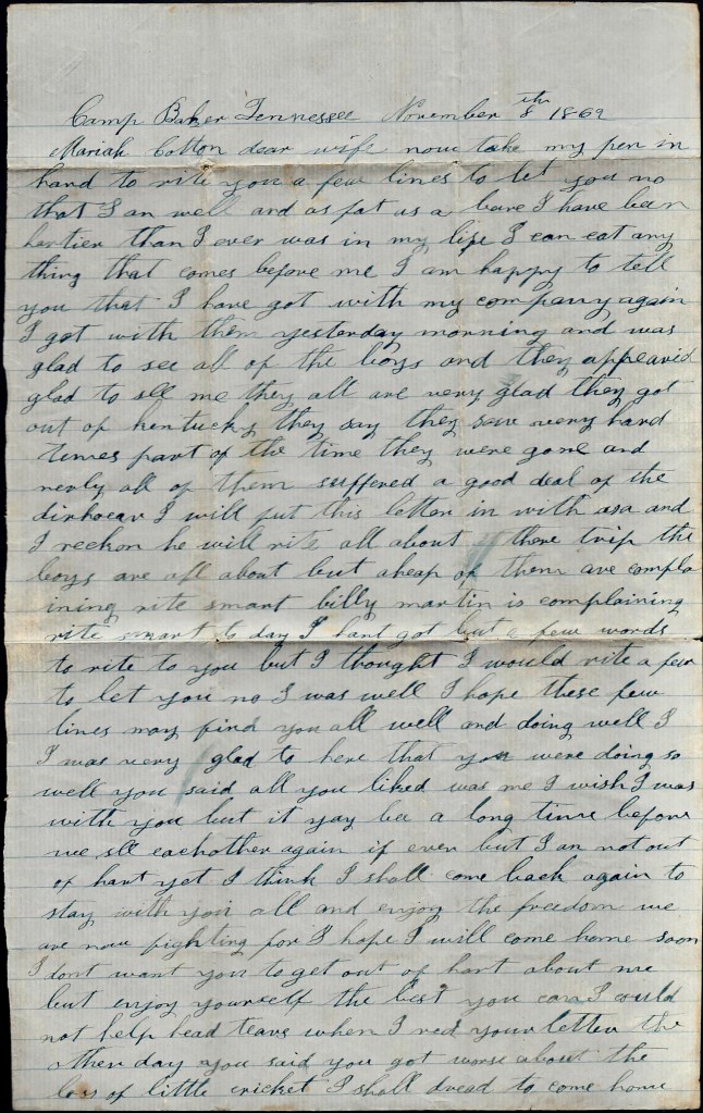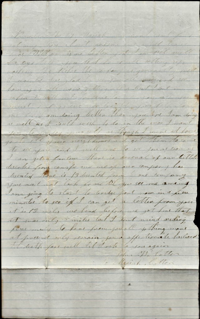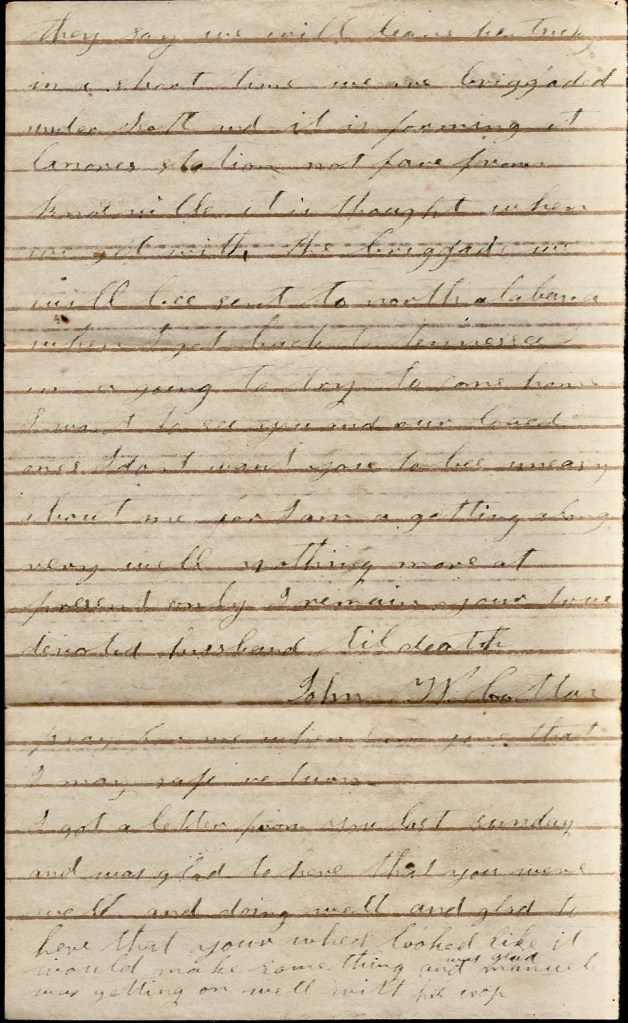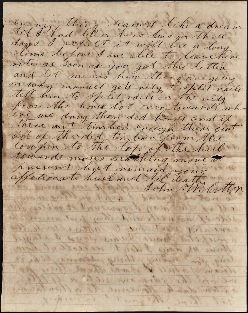When I get back to Tennessee, I am a going to try to come home. I want to see you and our loved ones. I don’t want you to be uneasy about me for I am a getting along very well. Nothing more at present—only I remain your true devoted husband till death. — John W. Cotton