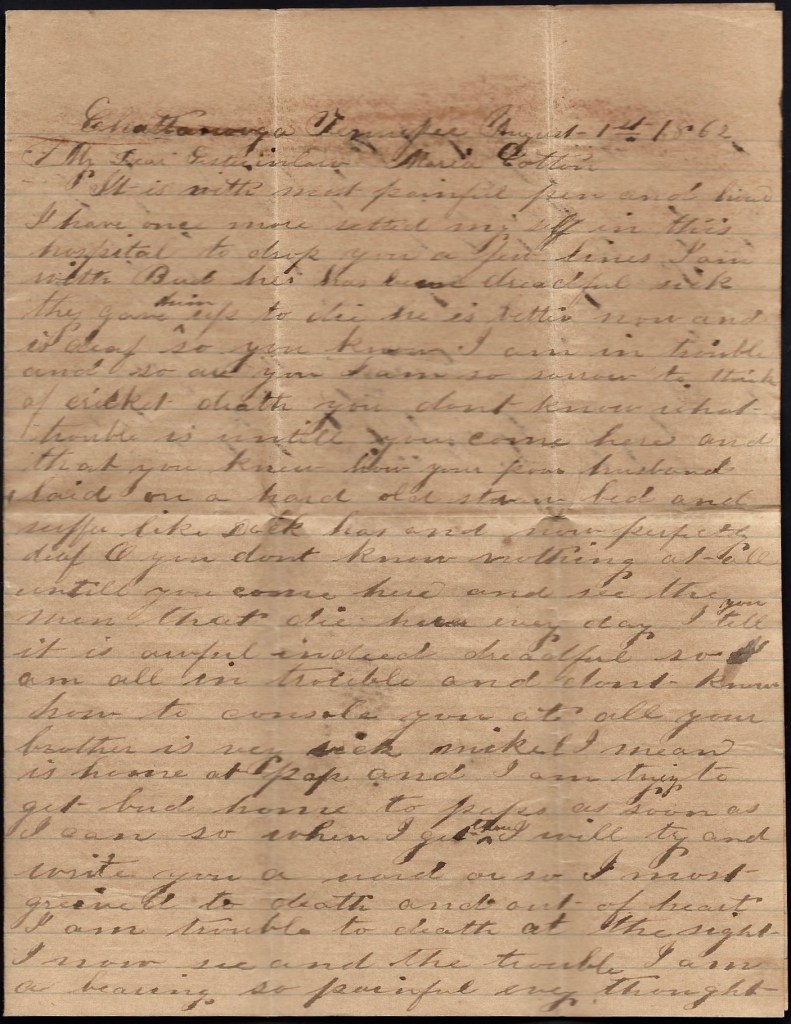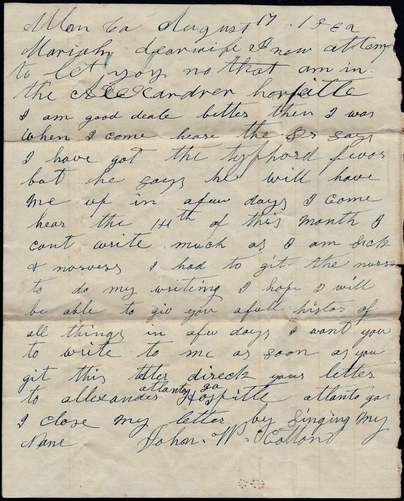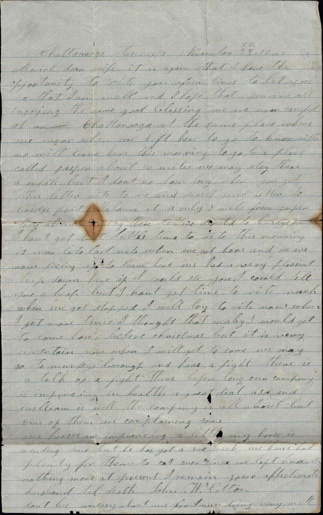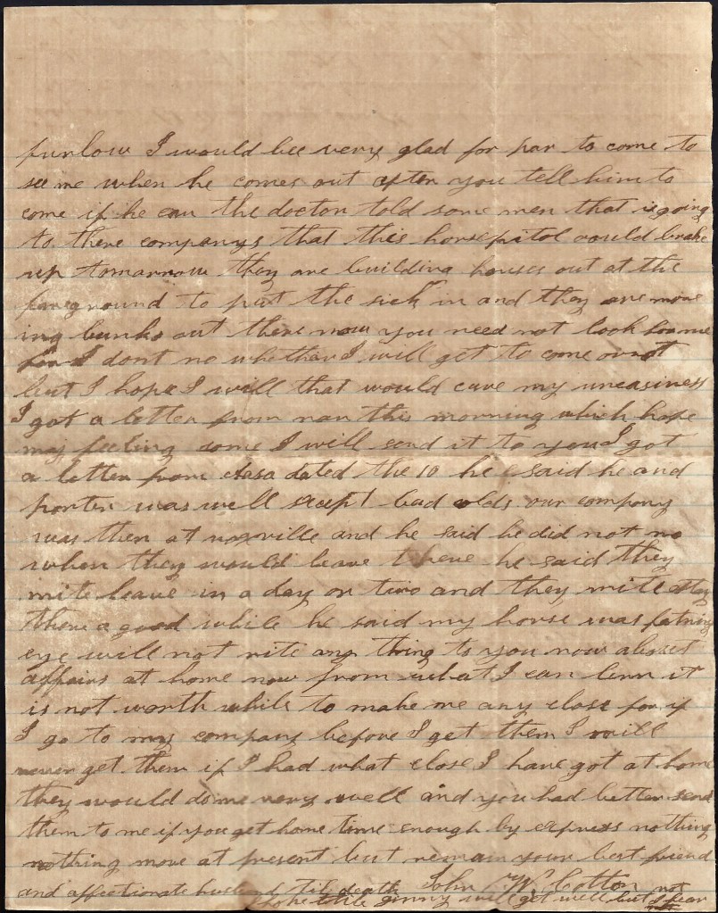 When I get back to Tennessee, I am a going to try to come home. I want to see you and our loved ones. I don’t want you to be uneasy about me for I am a getting along very well. Nothing more at present—only I remain your true devoted husband till death. — John W. Cotton