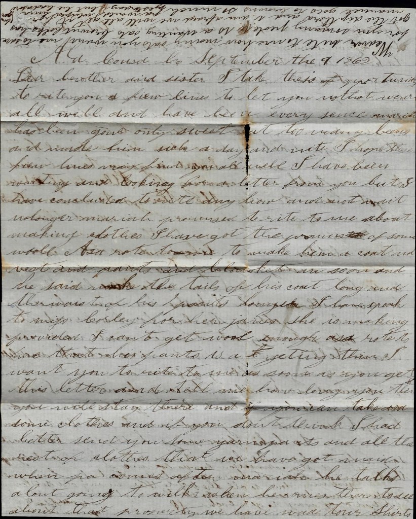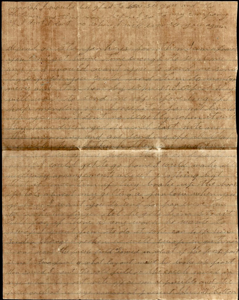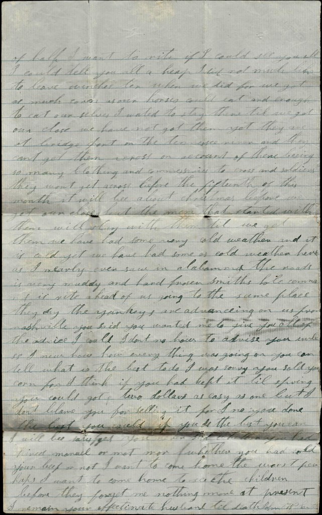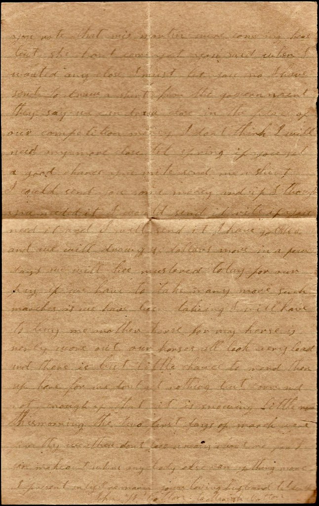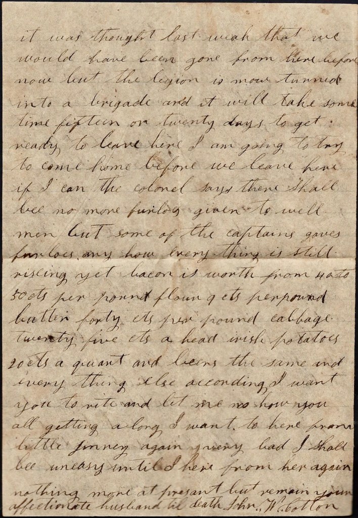 You wanted me to tell you what to do with your money. I don’t know what to tell you—only to do the best you can. You spoke of thread-beeing $15 per bunch. I think you had better buy cloth than to pay that much for thread if you can get such as suits you. As for my clothes. I shall soon need some pants but our captain says he is going to try to detail some men to go after our summer clothes. Nothing more at present—only I remain your true, affectionate husband till death. — John W. Cotton