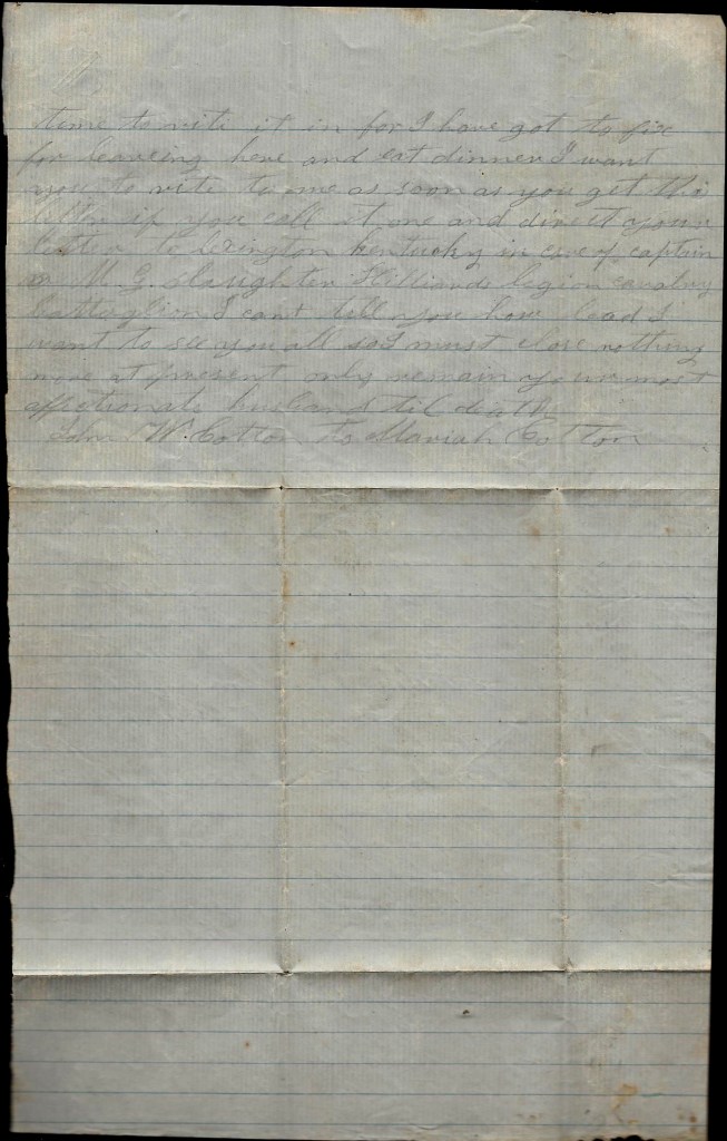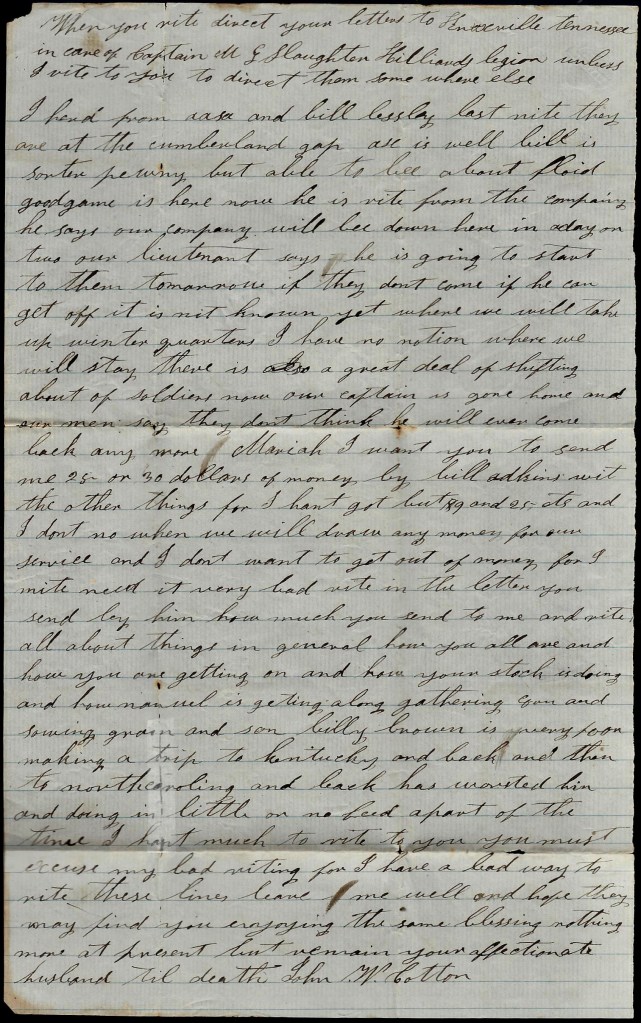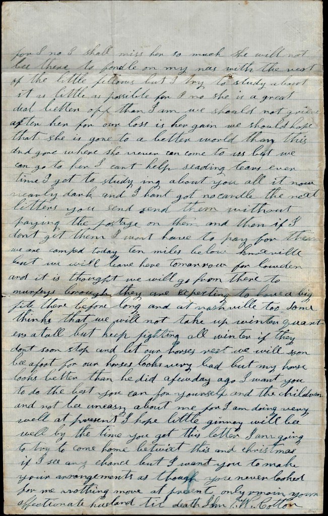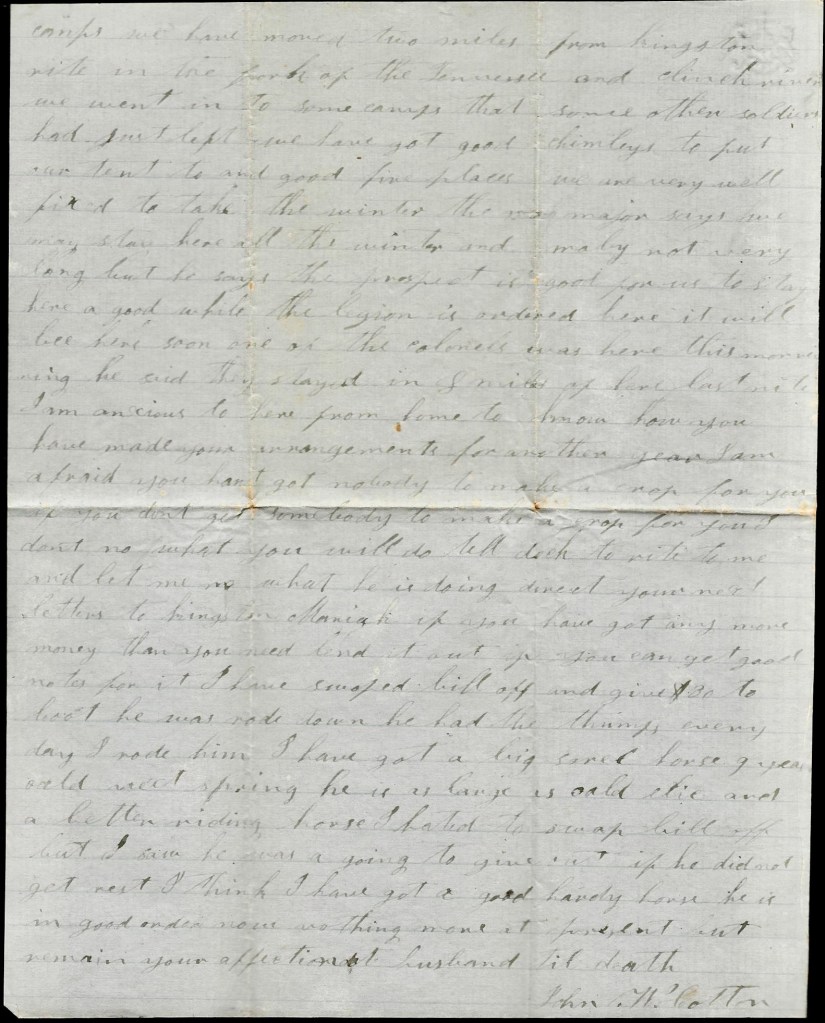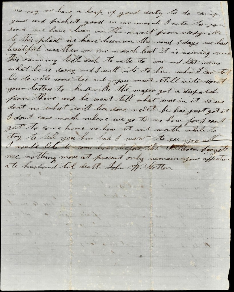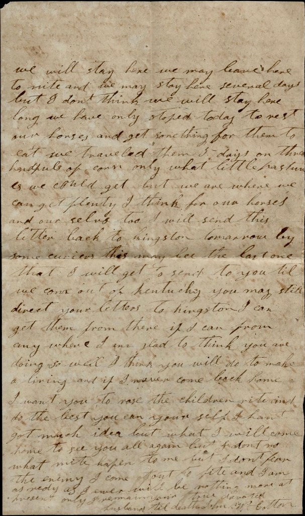 I will send this letter back to Kingston tomorrow by some couriers. This may be the last one that I will get to send to you till we come out of Kentucky. You may still direct your letters to Kingston. I can get them from there if I can from anywhere. I was glad to think you are doing so well. I think you you will do to make a living and if I never come back home I want you to raise the children right and do the best you can yourself. I hant got much idea but what I will come home to see you all again but I don’t know what will happen to me but I don’t fear the enemy. I come out to fight and I am as ready as I ever will be. Nothing more at present. Only I remain your true, devoted husband till death, — John W. Cotton
