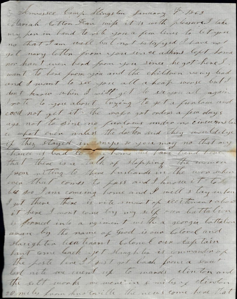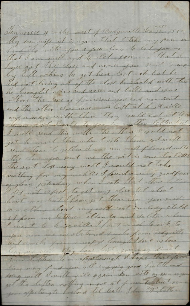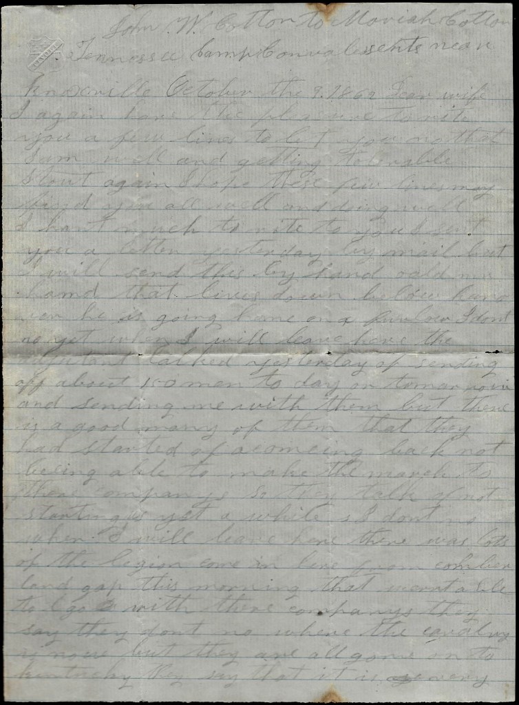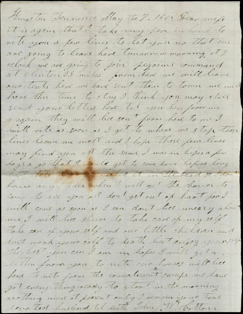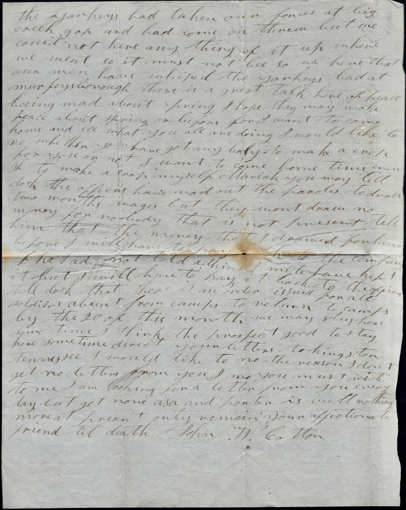 I will send this letter back to Kingston tomorrow by some couriers. This may be the last one that I will get to send to you till we come out of Kentucky. You may still direct your letters to Kingston. I can get them from there if I can from anywhere. I was glad to think you are doing so well. I think you you will do to make a living and if I never come back home I want you to raise the children right and do the best you can yourself. I hant got much idea but what I will come home to see you all again but I don’t know what will happen to me but I don’t fear the enemy. I come out to fight and I am as ready as I ever will be. Nothing more at present. Only I remain your true, devoted husband till death, — John W. Cotton