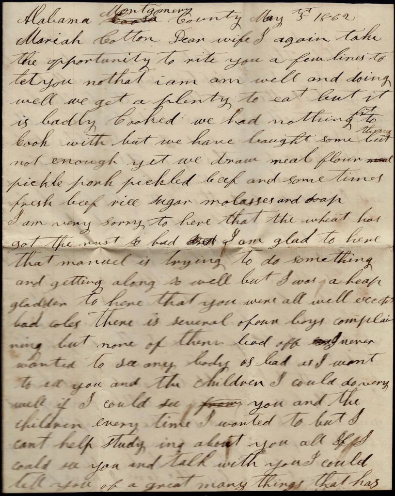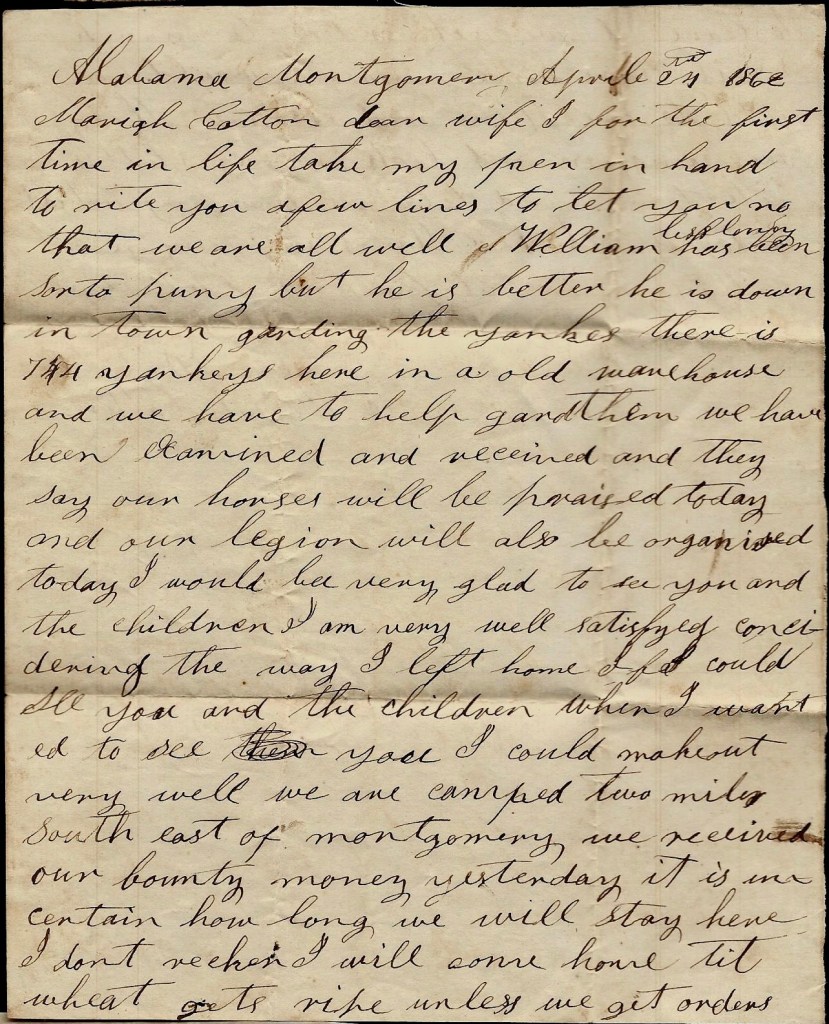 We are camped two miles southeast of Montgomery. We received our [$50] bounty money yesterday. It is uncertain how long we will stay here. I don’t reckon I will come home till wheat gets ripe unless we get orders to leave. If we get orders to march, I will come home sooner. I would be glad to be there and see how things are going on and look around a little. Write to me and tell me how my wheat is doing and how things are going on. Nothing more at present but remain your affectionate husband till death, — John W. Cotton