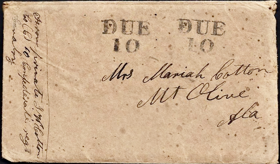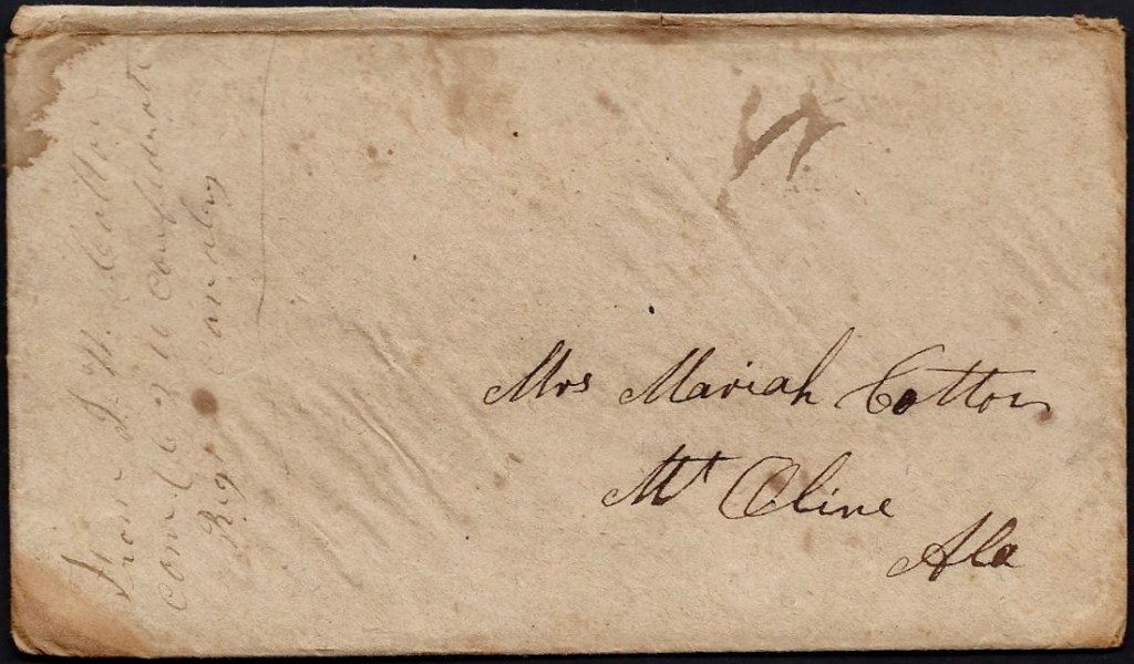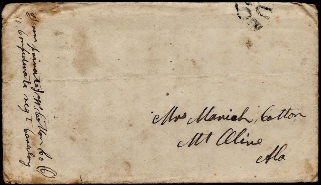 Margaret then proceeded to give the family another page and a half of thoughtful advice for getting the Cotton letters published, including one which was ultimately resulted in “Yours Till Death, Civil War Letters of John W. Cotton,” a publication of the University of Alabama Press, edited by Lucille Griffith, Assistant Professor of History at Alabama College, in 1951. This 128-page softbound book was transcribed and footnoted by Griffith and it is still available directly from the publisher and through the secondary book market, but my transcripts of the Cotton letters as well as the accompanying research posted here are my own, made directly from the original letters that have been purchased by my client. They not only include the letters that were in “Yours Till Death,” but several others.